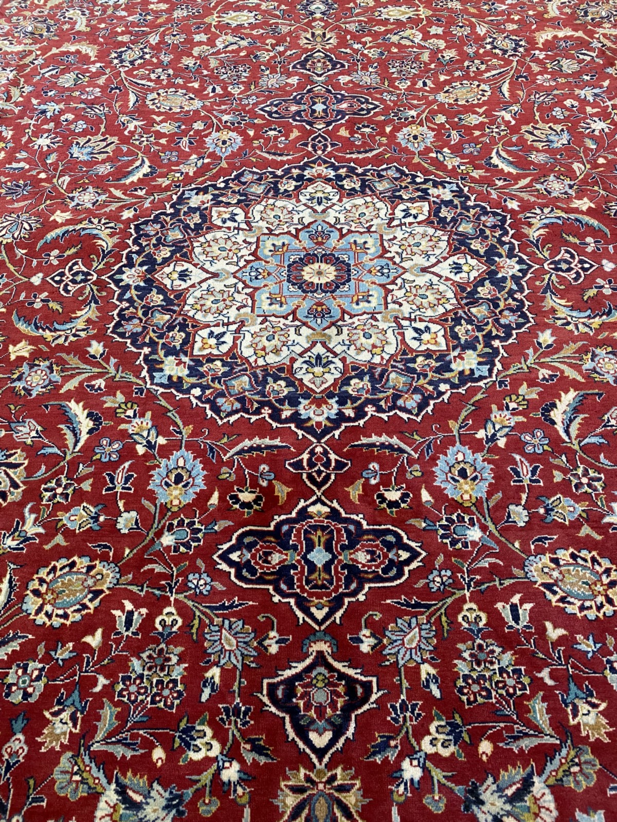 A SUBSTANTIAL PERSIAN KASHAN LAMB'S WOOL RUG. HAND-KNOTTED KHORSHID KASHAN MASTER ATELIER WEAVE. KASHAN BOOK COVER DESIGN WITH A CIRCULAR FLORAL MEDALLION WITH PENDANTS, IN AN OVAL RUBY RED FIELD OF SHAH ABBASSI PALMETTES AND FLORAL SPRAYS SURROUNDED BY PALMETTES AND SAZ LEAVES. INDIGO BORDER OF PALMETTES, FLORAL SPRAYS AND SAZ LEAVES. CERTIFICATE OF AUTHENTICITY & ORIGIN ON REQUEST. ORIGIN: IRAN (405 X 300 CM) (PLEASE NOTE THERE MAY BE SOME COLOUR VARIATION FROM PHOTOGRAPH)
