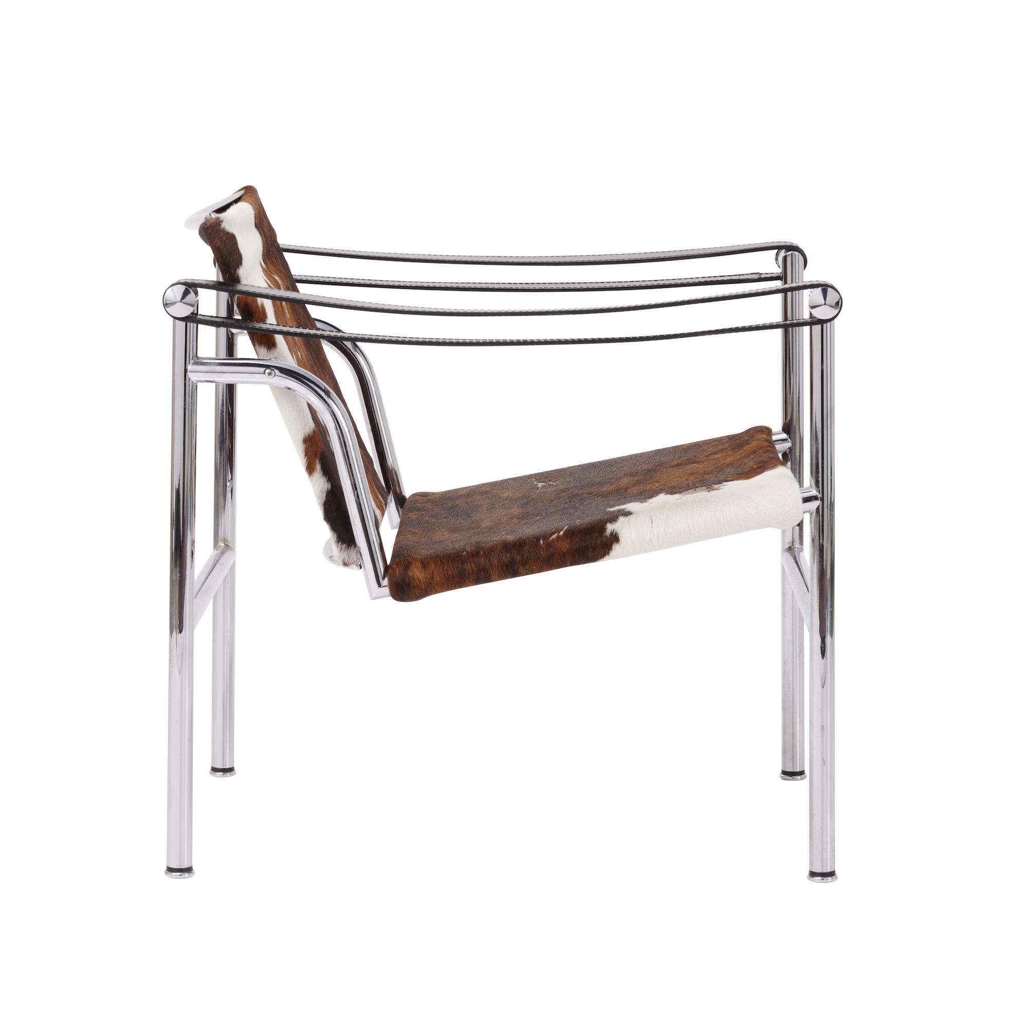Cowhide upholstered sling seat and backrest on chromed tubular steel frame with black leather armrests. Manufacturer details to frame.
