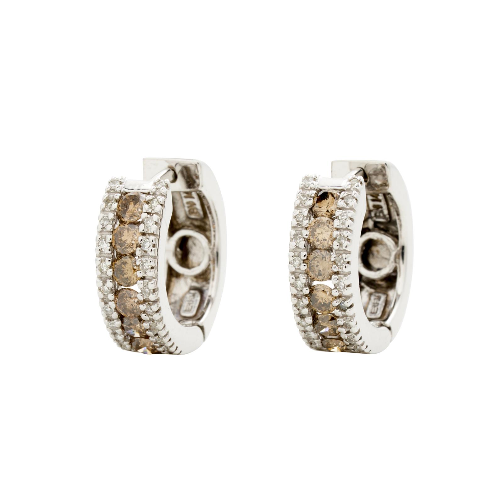 The ring consisting of a central row cognac round brilliant cut diamonds flanked by outer rows of micro claw set white diamonds. The earrings ensuite are of huggie style, flat profile and set in the same fashion as the ring, ring size N, gross weight approximately 4.3 grams and 6.0 grams respectively.