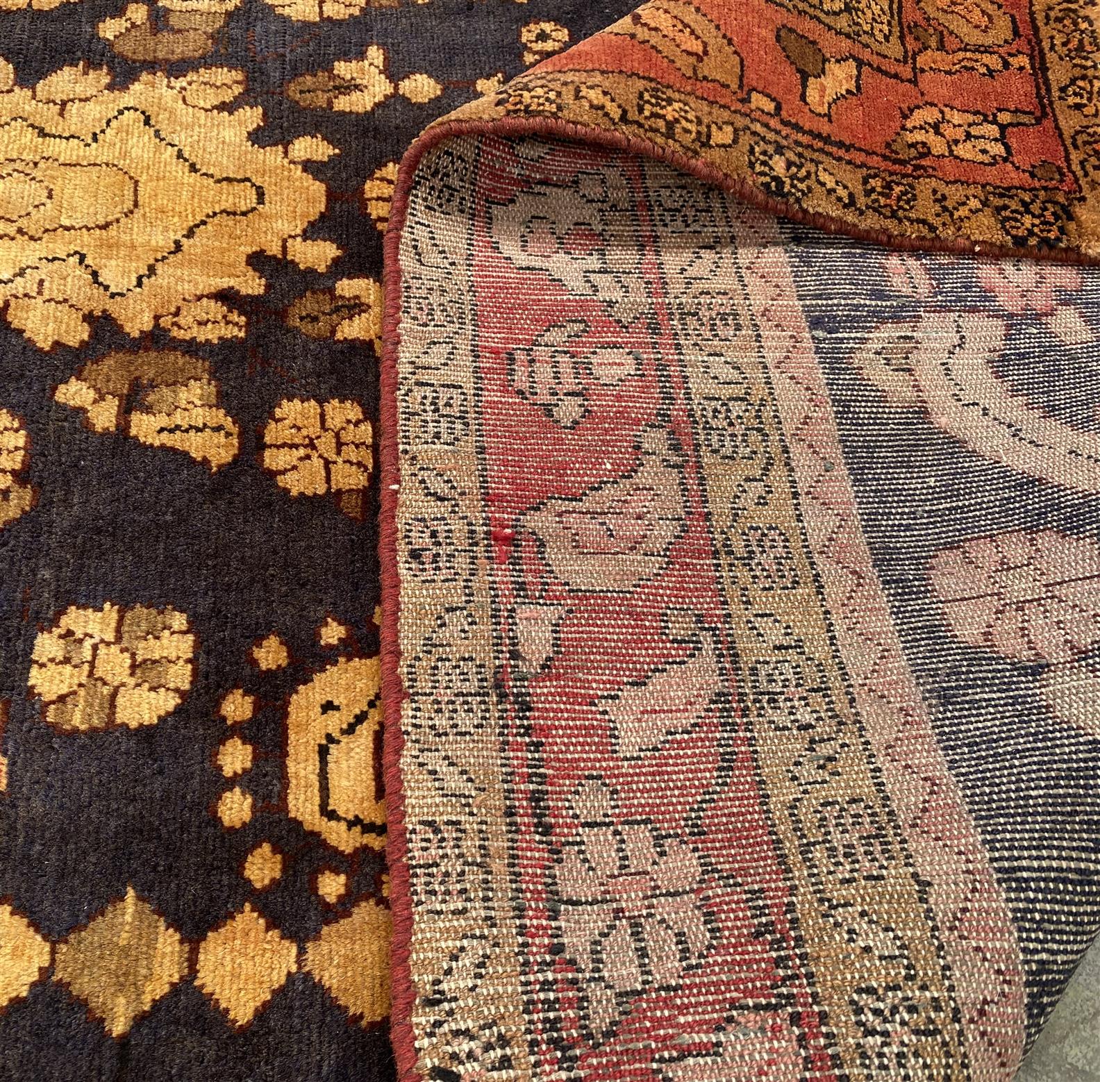 A NOMADIC PERSIAN AVAJ ENTRANCE RUG WITH 100% HAND-SPUN WOOL PILE & ALL VEGETABLE DYES. HAND-KNOTTED NOMADIC WEAVE FROM THE QAZVIN COUNTY WITH DESIGN OF CENTRAL MEDALLION SET AGAINST DOUBLE URNS BEARING FLORAL FOLIAGE AND FLOWER HEADS. THE ENTIRE IN SHADES OF INDIGO &  RUST WITH GOLDEN-TONED HIGHLIGHTS. SIZE: 308 X 150 CM - ORIGIN: IRAN (PLEASE NOTE THERE MAY BE SOME COLOUR VARIATION FROM PHOTOGRAPH)
