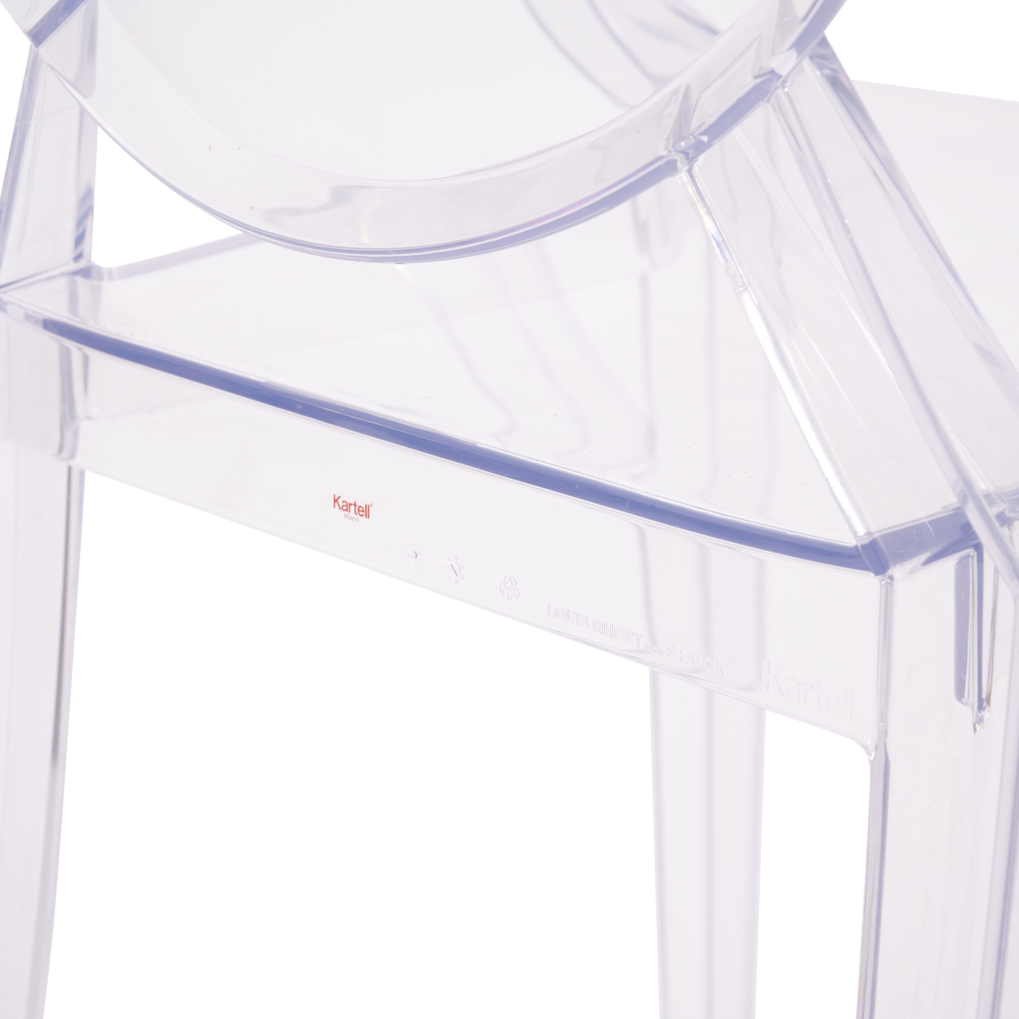 Stackable dining chair, formed and inspired by a French armchair from the era of Louis XVI. Transparent polycarbonate shell, with manufacturer's mark to rear of seat.