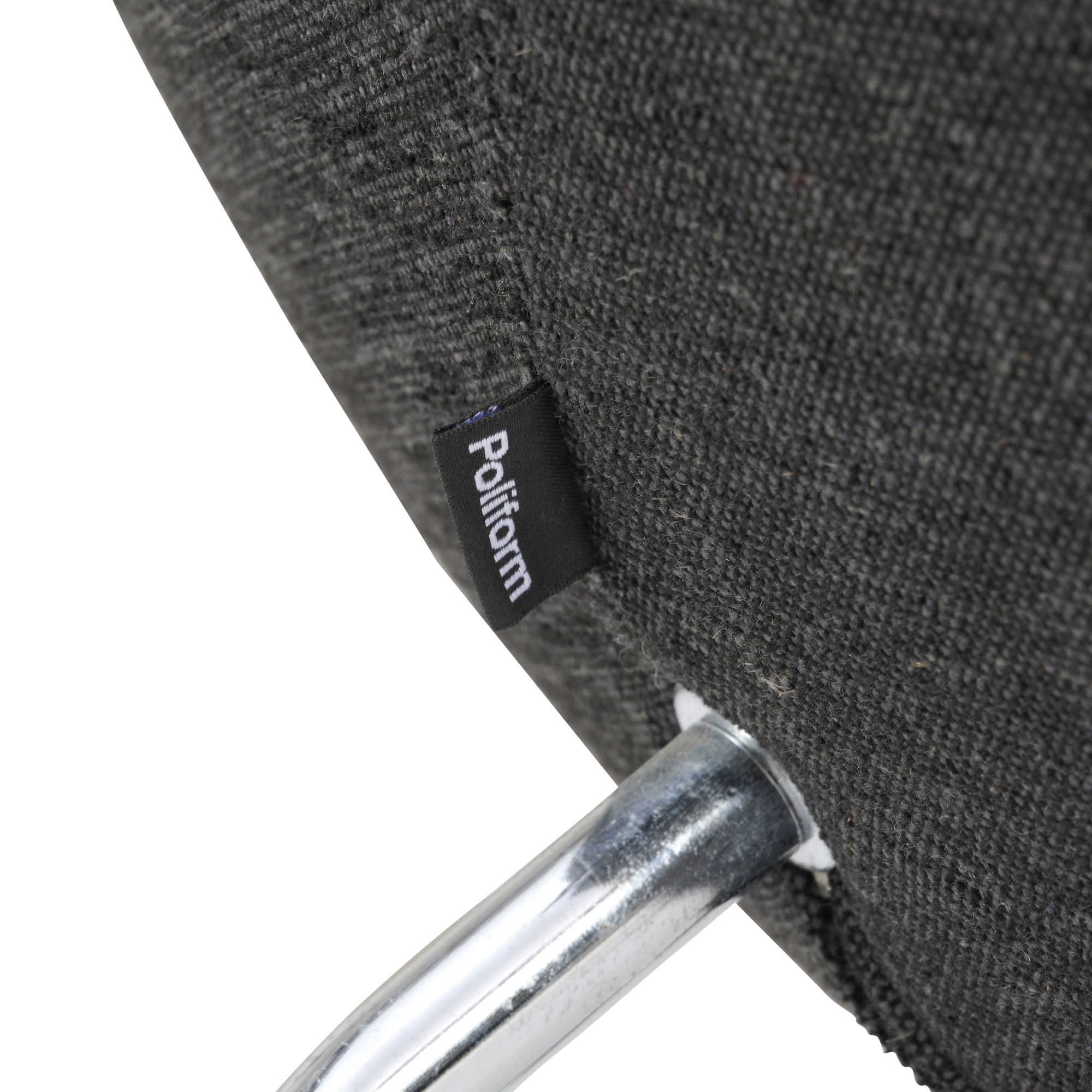 Pair of low-profile, curved armchairs with a cross sled base in a chrome finish. Upholstered in a dark charcoal textile, with manufacturer's pip label at side seam.