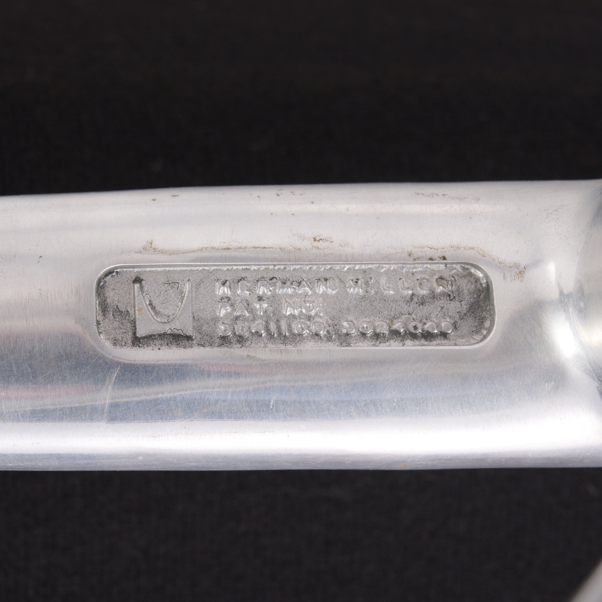 Leather shows an indication of wear on the low corners of the seat at the front, and there is a small tear approximately 3cm in length on the back left of the high-back near the seam. The remaining leather upholstery appears intact and free from notable blemishes. The aluminium frame has a slight cloudy appearance in line with age and use, with some surface scratches to the armrests and four point base. The seat swivels fluidly.