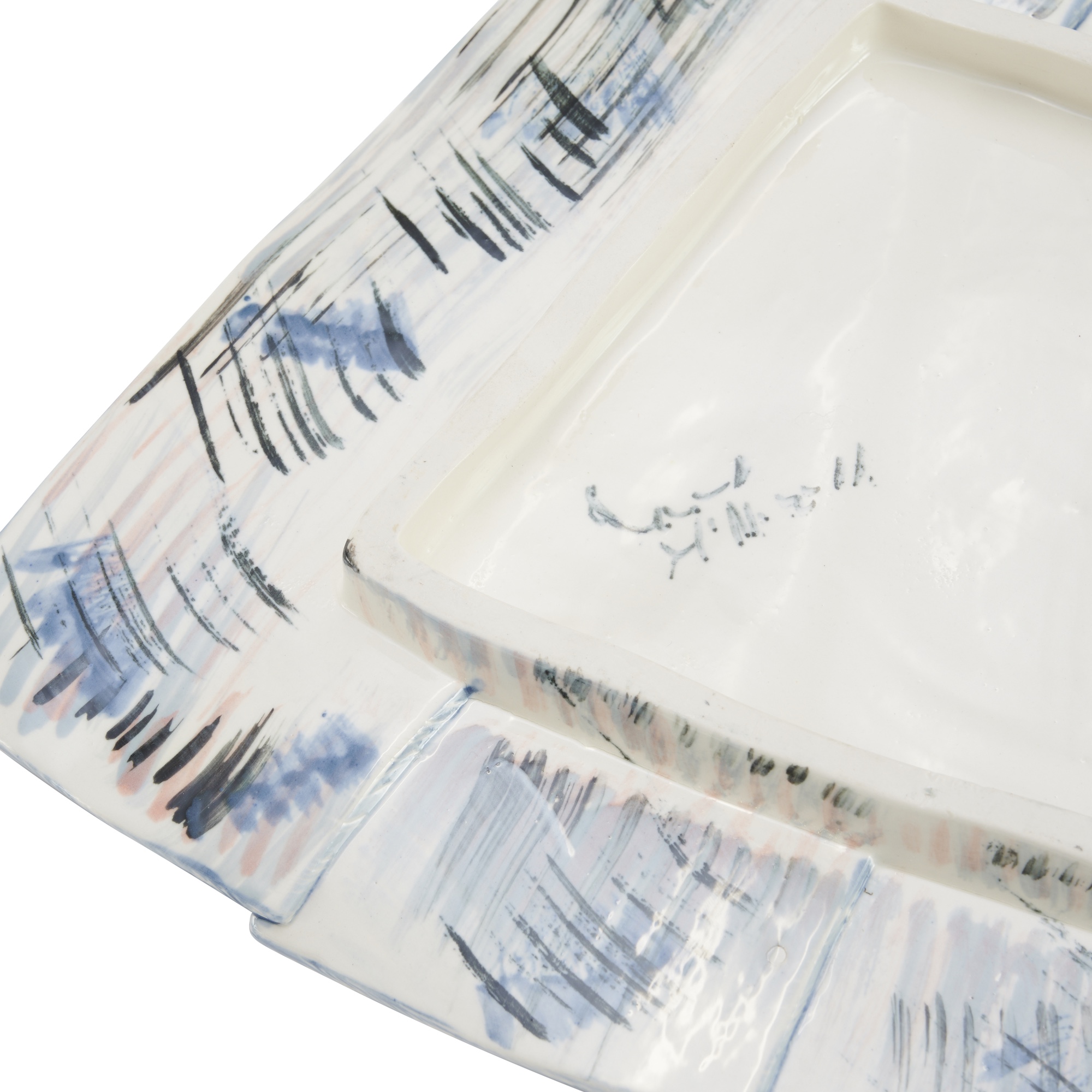 Sculptural slab built and moulded earthenware with all over abstract brushstroke glaze. Pieces are all signed or initialled to bases.