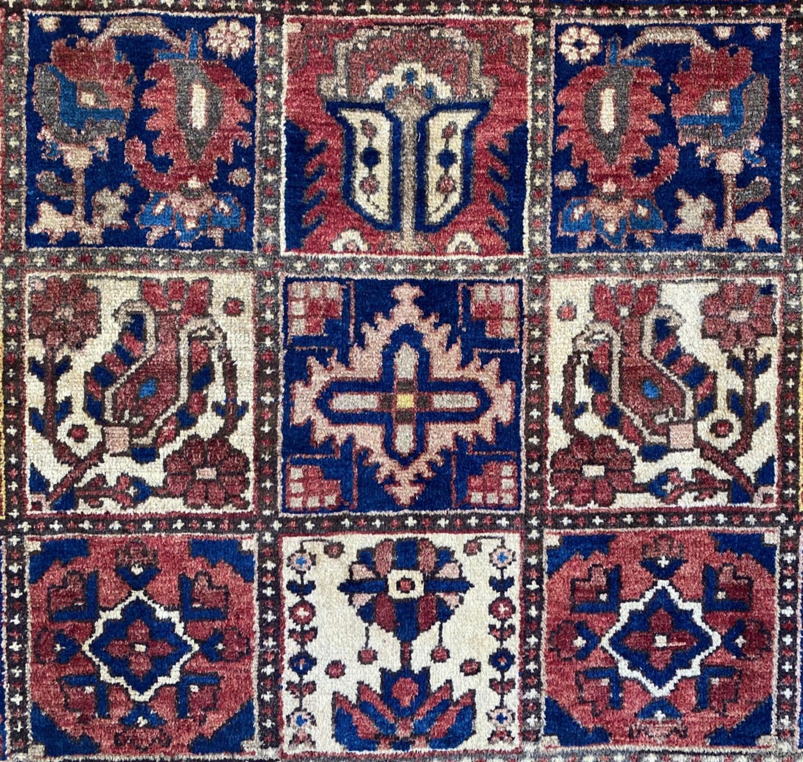 HAND-KNOTTED WEAVE FROM THE SOUTHERN CHAHARMAHAL & BAKHTIARI PROVINCE WITH TRADITIONAL PICTORIAL GARDEN DESIGN WITH PANELS CONTAINING PERSIAN GARDEN THEMES OF WILLOW TREES, FLORAL SHRUBS & AUTUMN TREES. BORDER OF FLORAL SHRUBS. THE ENTIRE IN NATURAL DYED SHADES OF CREAM, INDIGO, TERRACOTTA & BLUE.