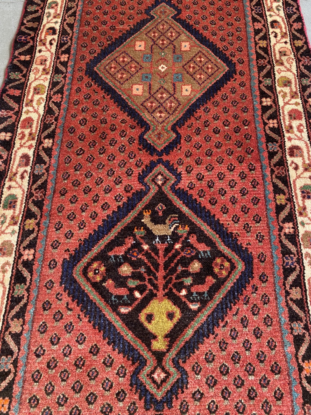 HAND-KNOTTED VILLAGE WEAVE FROM THE ARAK REGION IN WEST-CENTRAL IRAN WITH TRADITIONAL DESIGN OF DIAMOND-SHAPED MEDALLIONS CONTAINING HERATI PATTERNS & URNS BEARING FLORAL FOLIAGE & BIRD FORMS IN A DEEP RED FIELD OF PAISLEY MOTIFS. BORDER OF RAMBLING FLOWER HEADS.