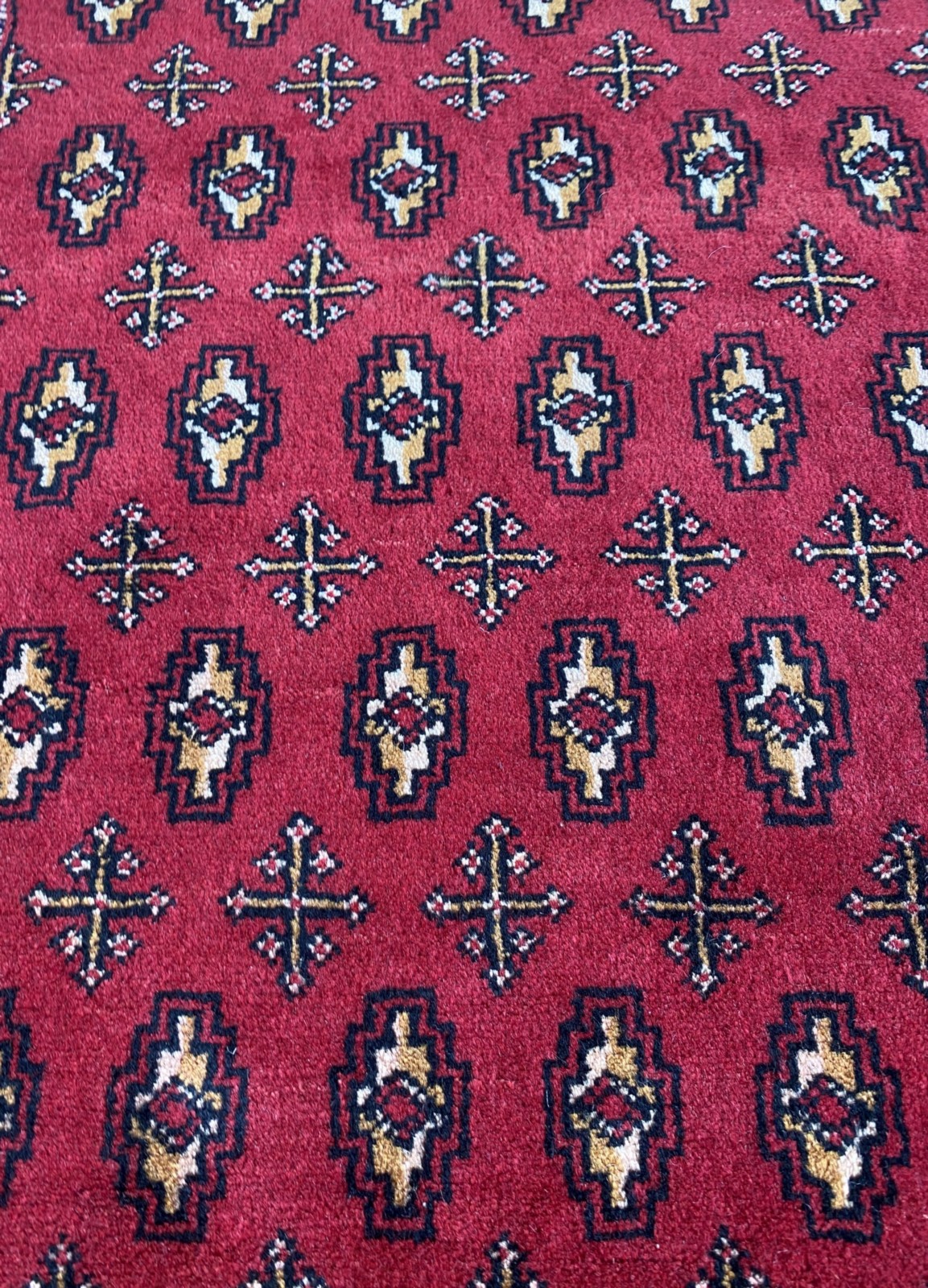 TRIBAL WEAVE FROM THE NORTH-EASTERN KHORASAN PROVINCE WITH DESIGN OF REPEATING TURKOMAN TEKKE GUL MOTIFS SET WITHIN A CRIMSON RED BACKGROUND. GEOMETRIC-PATTERNED BORDER.
