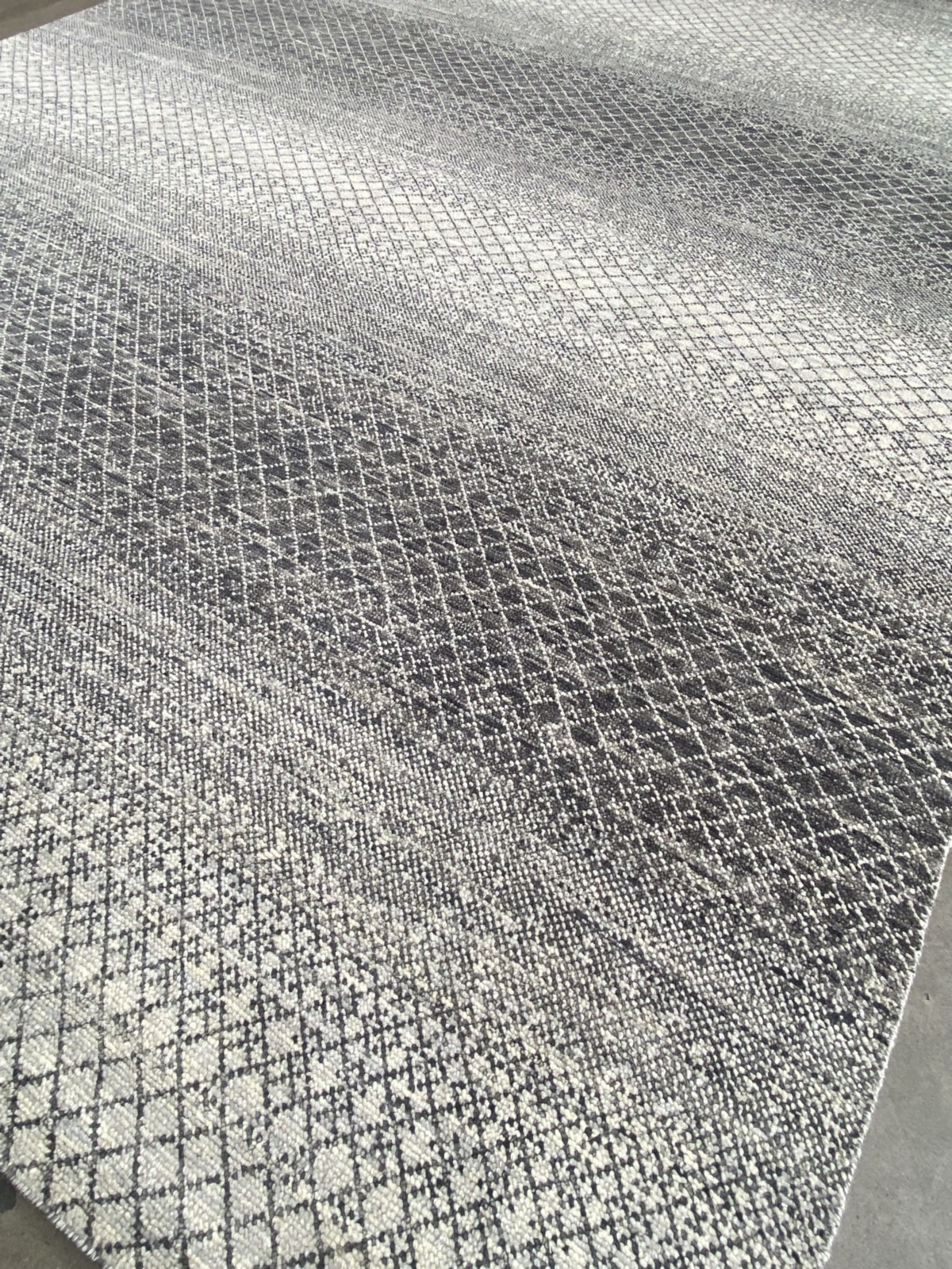 GALLERY DISPLAYED. SOLID HAND-KNOTTED WEAVE. CONTEMPORARY LATTICE-PATTERNED DESIGN IN SHADES OF CREAM, BROWN & GREY.