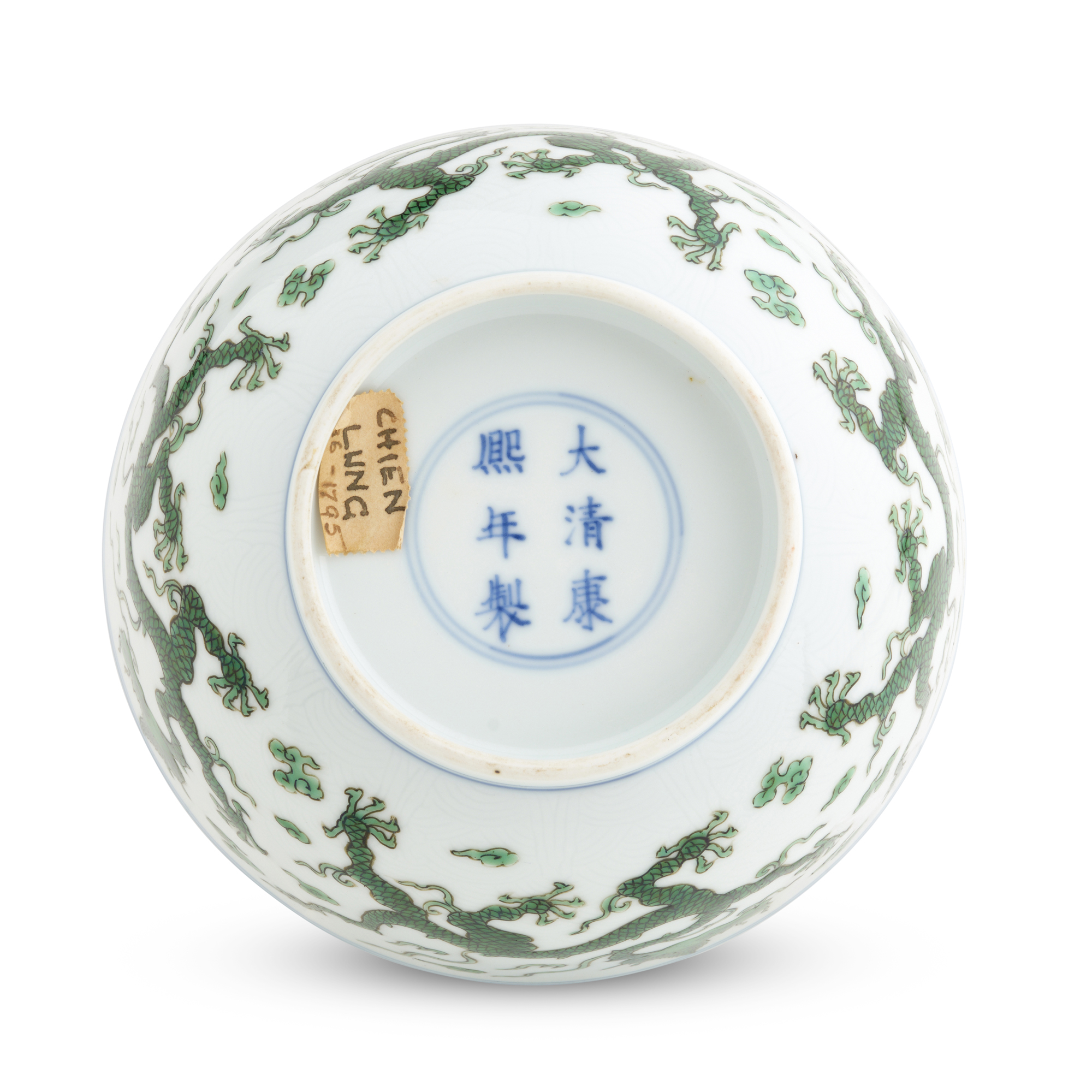 A CHINESE INCISED BLUE, WHITE AND GREEN ENAMEL DRAGON BOWL, KANGXI MARK, MID QING DYNASTY, 18TH CENTURY