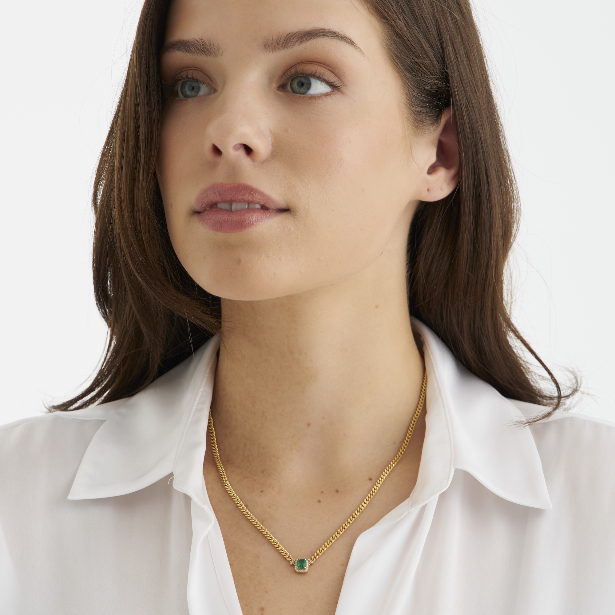 Centring a corner claw-set emerald-cut emerald weighing approximately 0.75 carats, within a surround of round brilliant-cut diamonds, to an integral flat curblink chain completed by a parrot clasp, length 420mm - 480mm, gross weight approximately 8.2 grams.