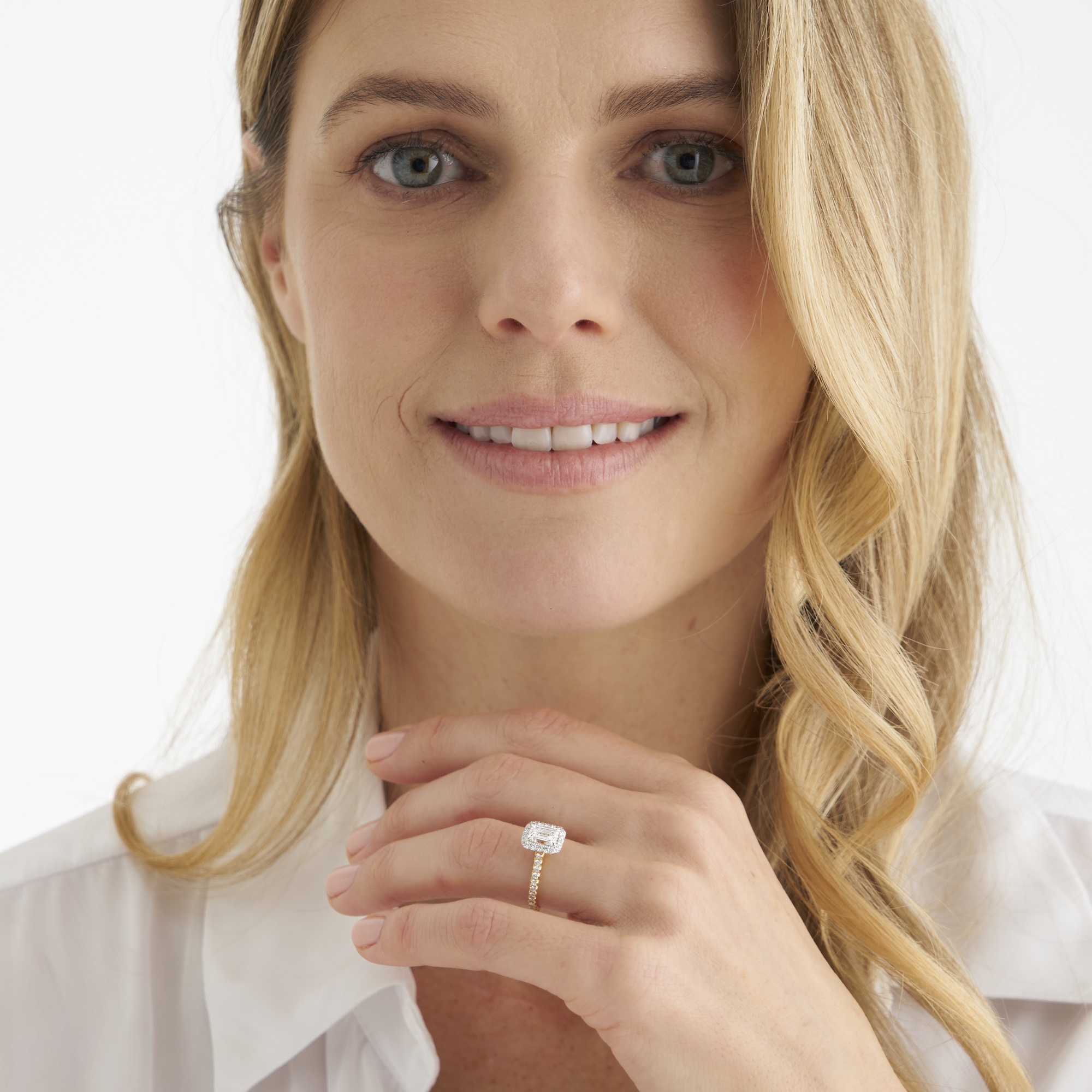 Centring an emerald-cut diamond weighing 1.01 carats, within a brilliant-cut diamond surround and shoulders, the diamonds together weighing approximately 0.25 carats. size J, gross weight approximately 3.30 grams.