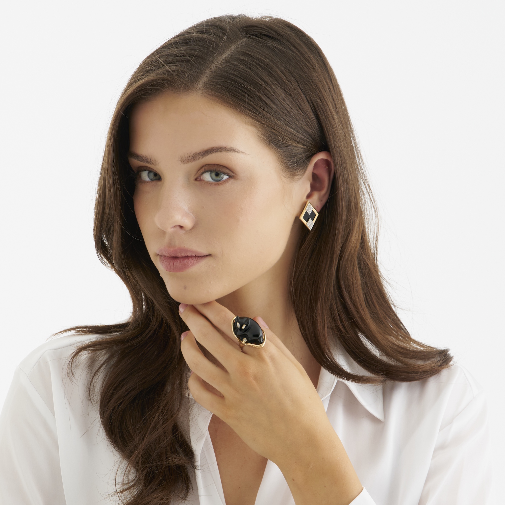 Comprising a ring of carved onyx modelled as a cat with brilliant-cut diamond set eyes, together with a pair of earrings composed of a diamond shaped onyx plaque, with diamond shaped pavé-set diamond accents, to post and clip fittings, size O, earring length 28mm, gross weight approximately 30.5 grams.