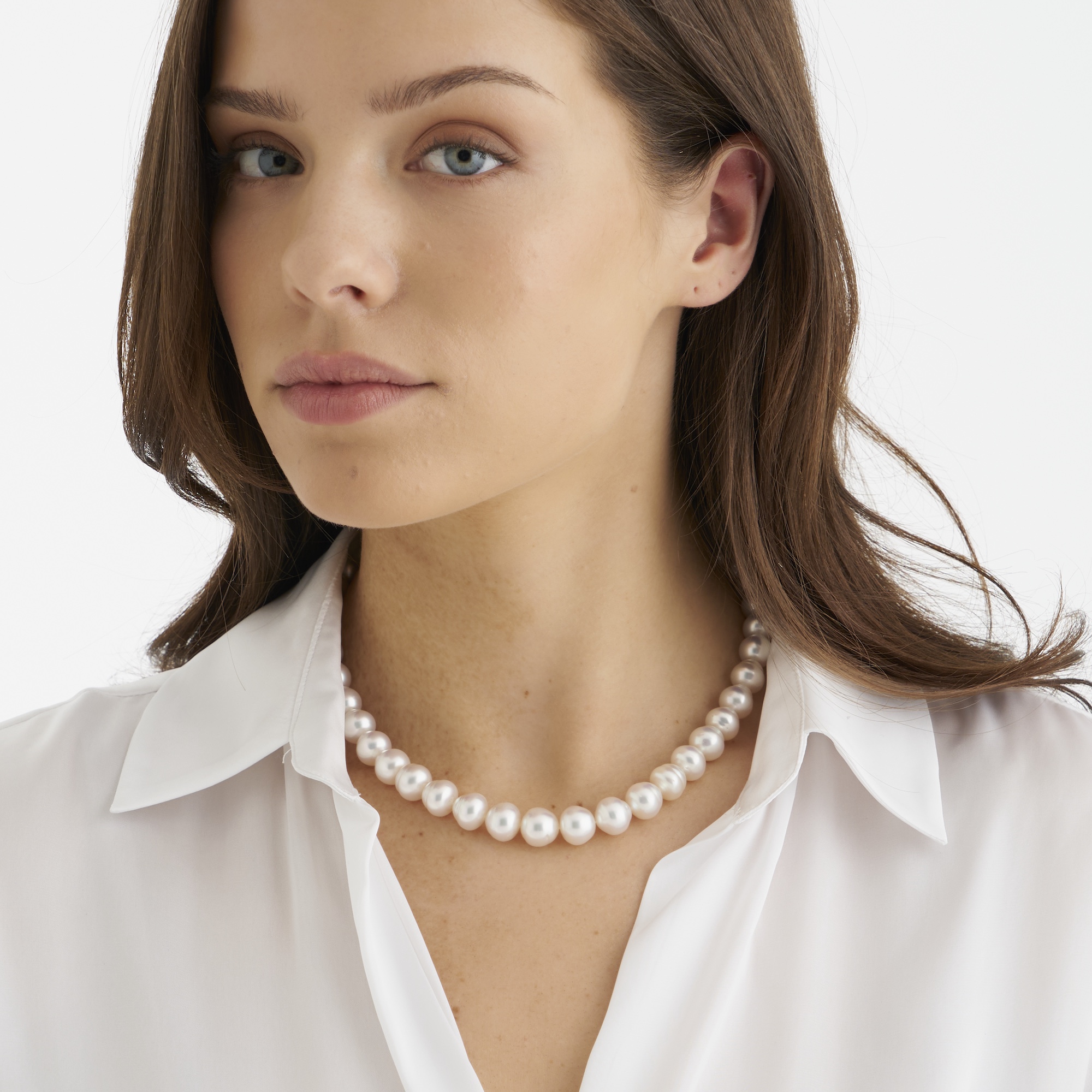 Comprising forty-two semi-baroque pearls measuring approximately 9.0mm to 12.0mm, with feature collet-set brilliant-cut diamond to one pearl, completed by a concealed spring loaded clasp, length 440mm.