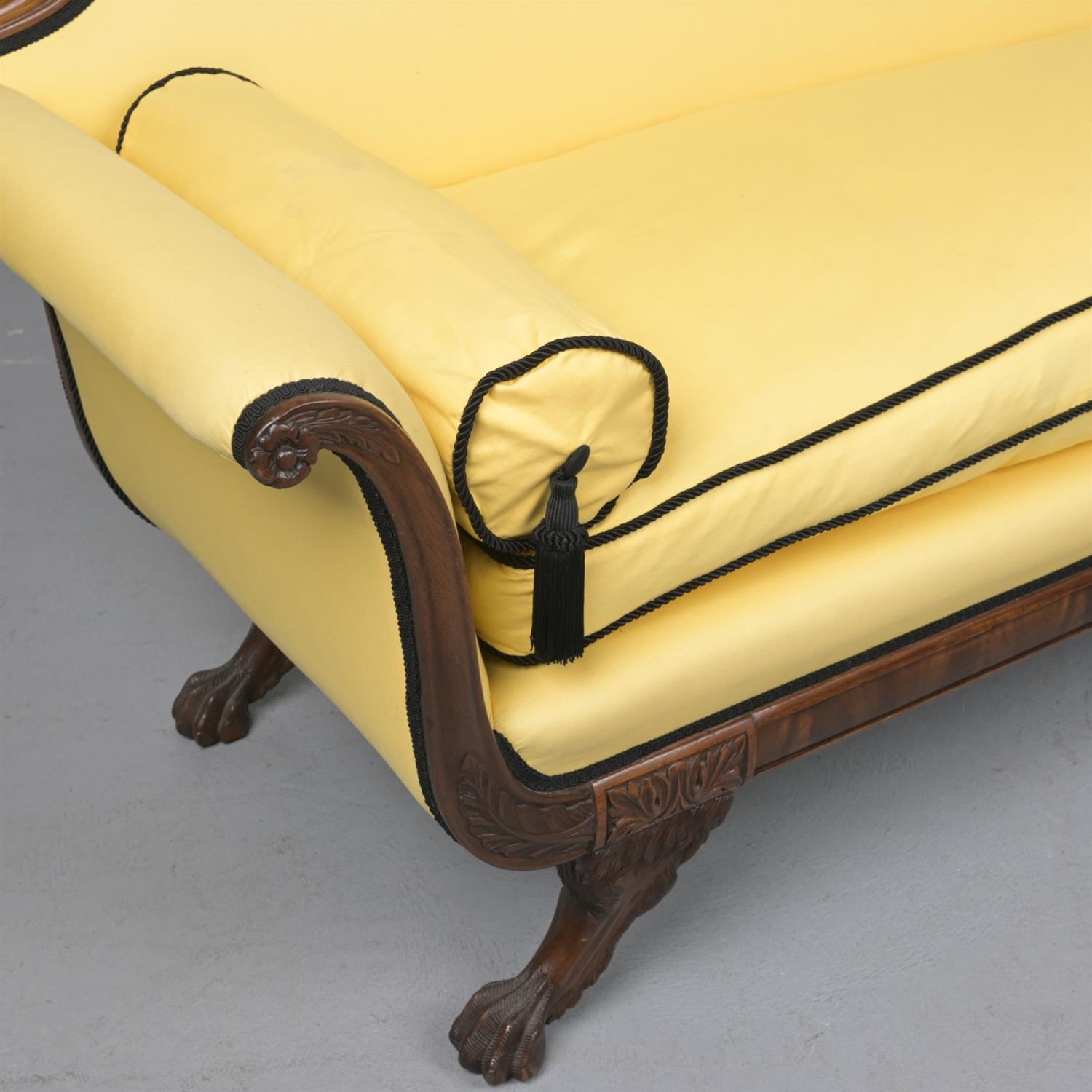 A WILLIAM IV-STYLE MAHOGANY AND UPHOLSTERED SOFA, WITH MATCHING BOLSTER CUSHIONS (84H X 207W X 73D CM)