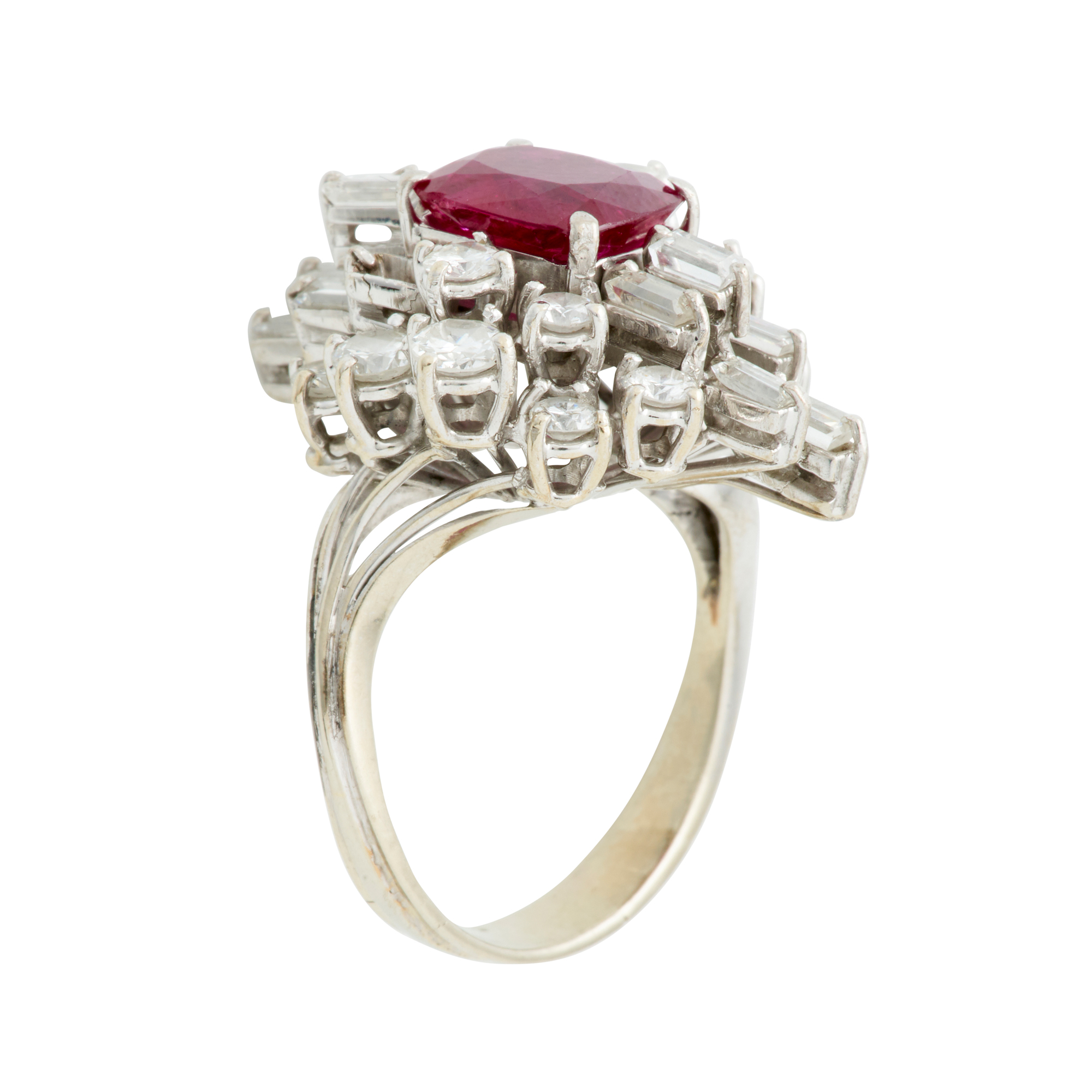 Of cluster design, centering a corner claw-set cushion-cut ruby weighing approximately 3.75 carats, surrounded by claw-set baguette and round brilliant cut diamonds in a multi-tiered setting, the diamonds together weighing approximately 2.16 carats, size N, gross weight approximately 8.5 grams.