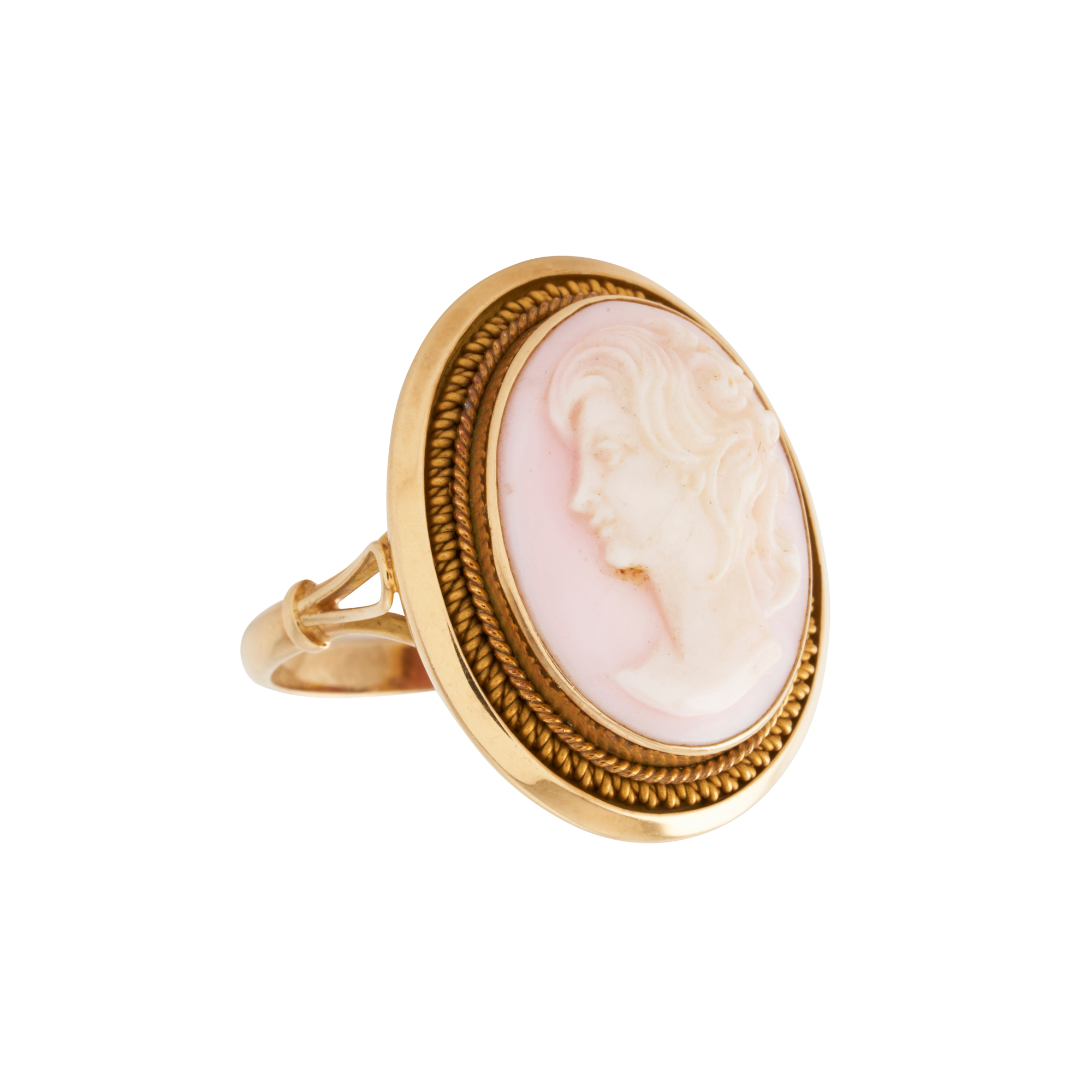 Centring a shell cameo depicting a maiden in profile within a decorative surround, size O, gross weight approximately 9.90 grams.