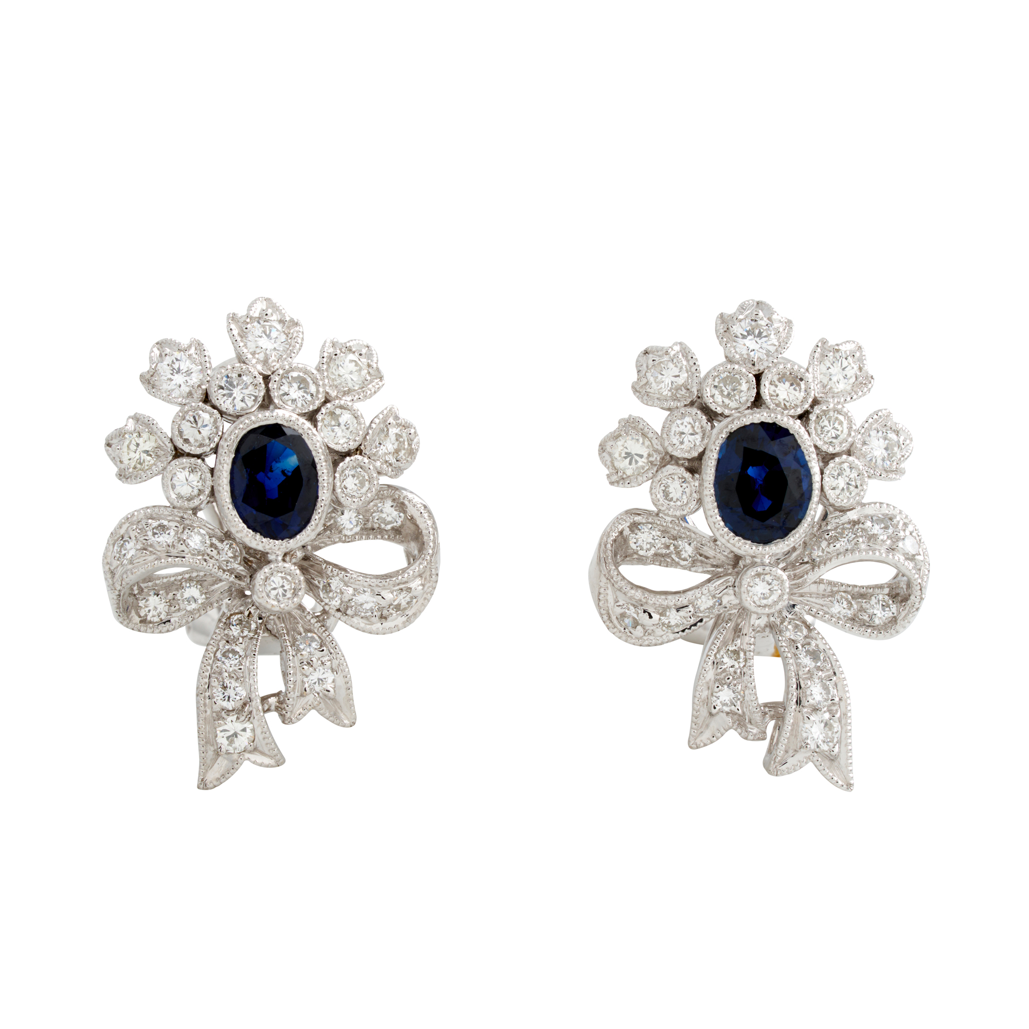Comprising a brooch modelled as a stylised bouquet of flowers with bow motifs, set throughout with collet-set oval and round-cut sapphires and millegrain-set throughout with brilliant cut diamonds; earrings ensuite, modelled as mini floral poseys collet-set with an oval-cut sapphire within a surround of grain-set diamonds, the sapphires together weighing approximately 1.70 carats and the diamonds together weighing approximately 1.25 carats, earrings to clip fittings, earring length 19mm, brooch length 35mm, gross weight approximately 16.1 grams.