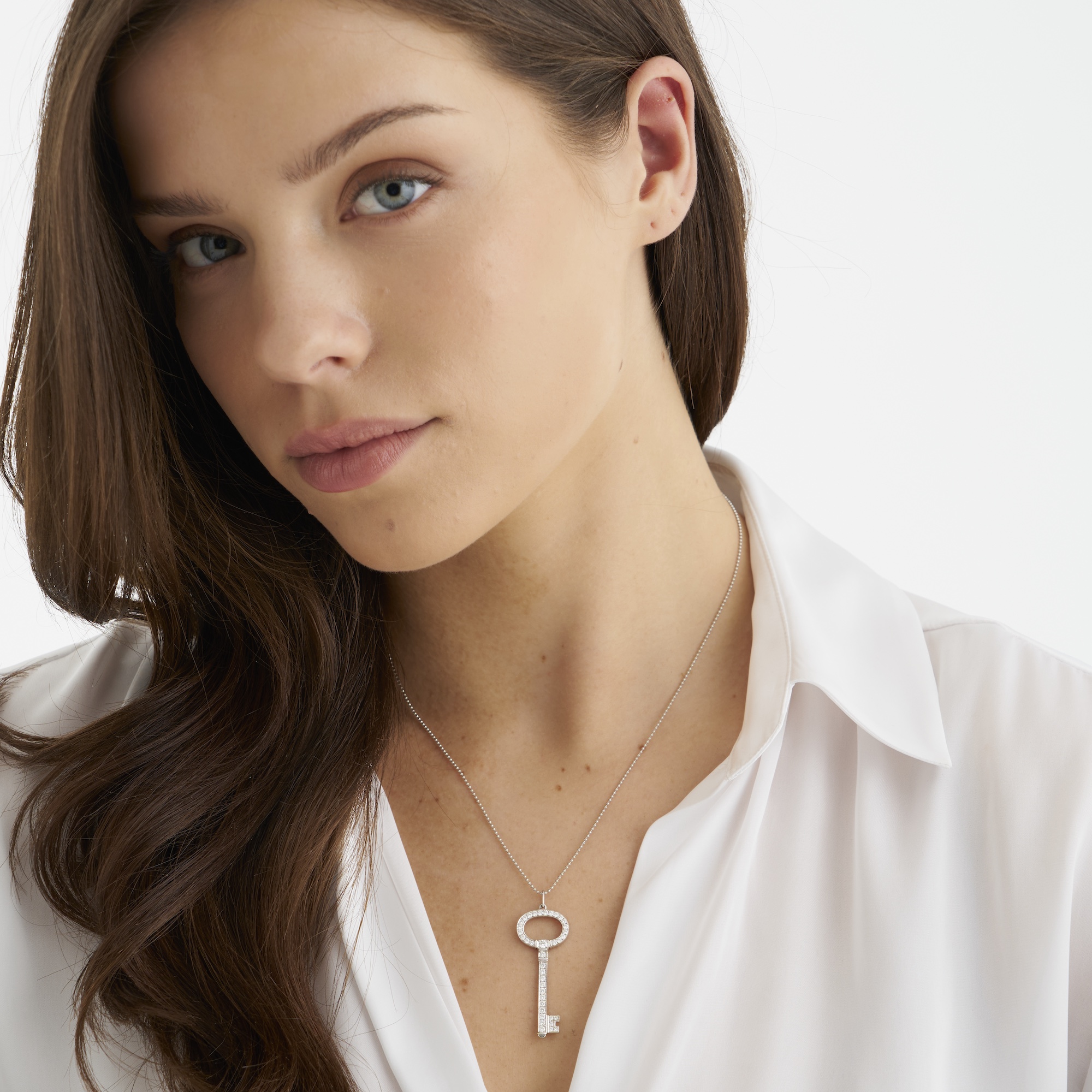 Modelled as a key, set throughout with grain-set round brilliant-cut diamonds together weighing approximately 0.60 suspended from a fine ball link chain completed by a bolt ring clasp, pendant length 45mm, chain length 450mm, signed Tiffany & Co., gross weight approximately 7.2 grams.