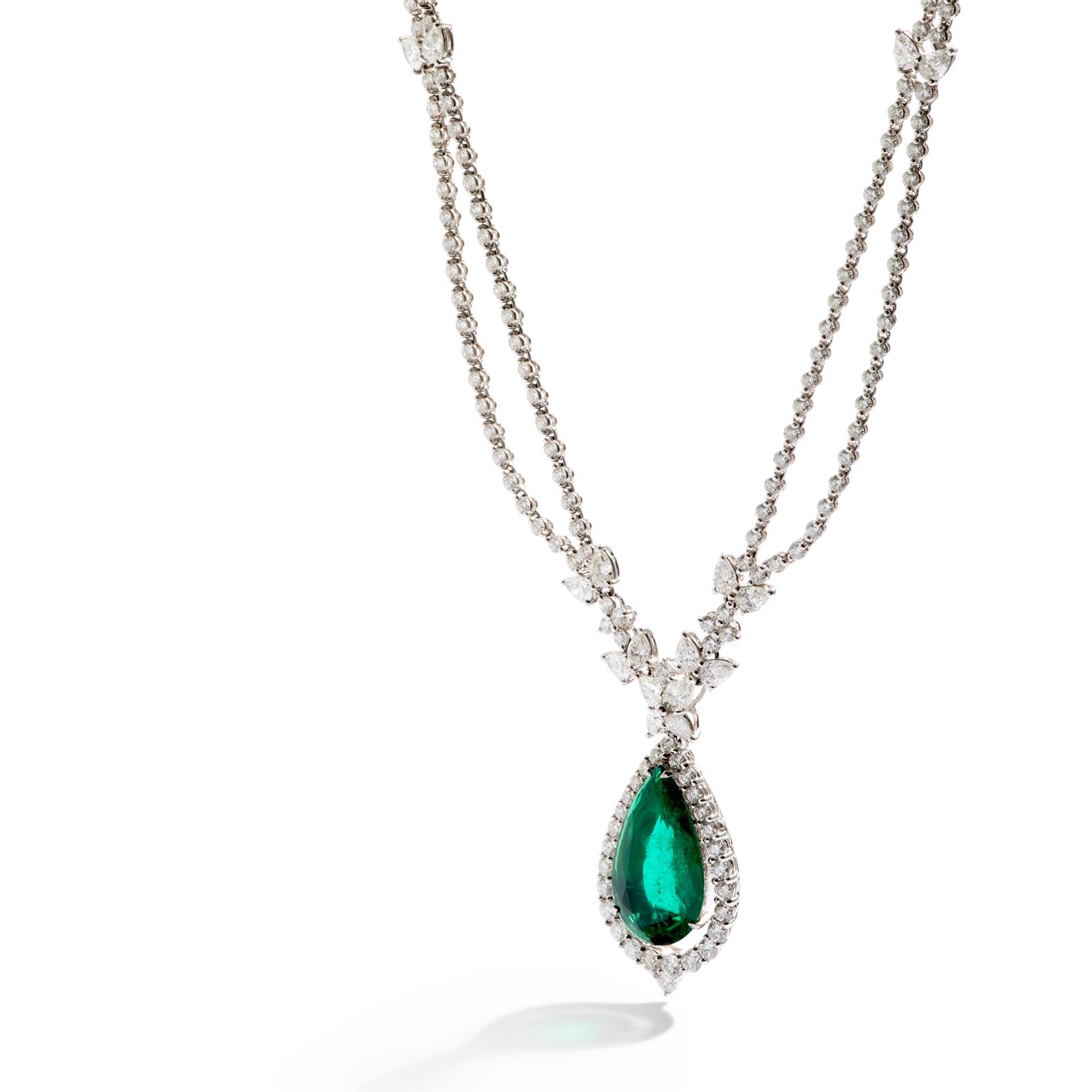 Terminating on a cluster swing-drop centring a claw-set pear-shaped emerald framed by a line of brilliant-cut and pear diamonds surmounted by a cluster of claw-set pear and brilliant-cut diamonds supported from a double row of claw-set brilliant-cut diamonds completed by a continuous line of collet-set diamonds to a concealed clasp, the emerald and diamonds together weighing approximately 4.05 carats and 7.23 carats respectively, mounted in 18ct white gold, gross weight approximately 27.4 grams, length 450mm, drop 40mm.
