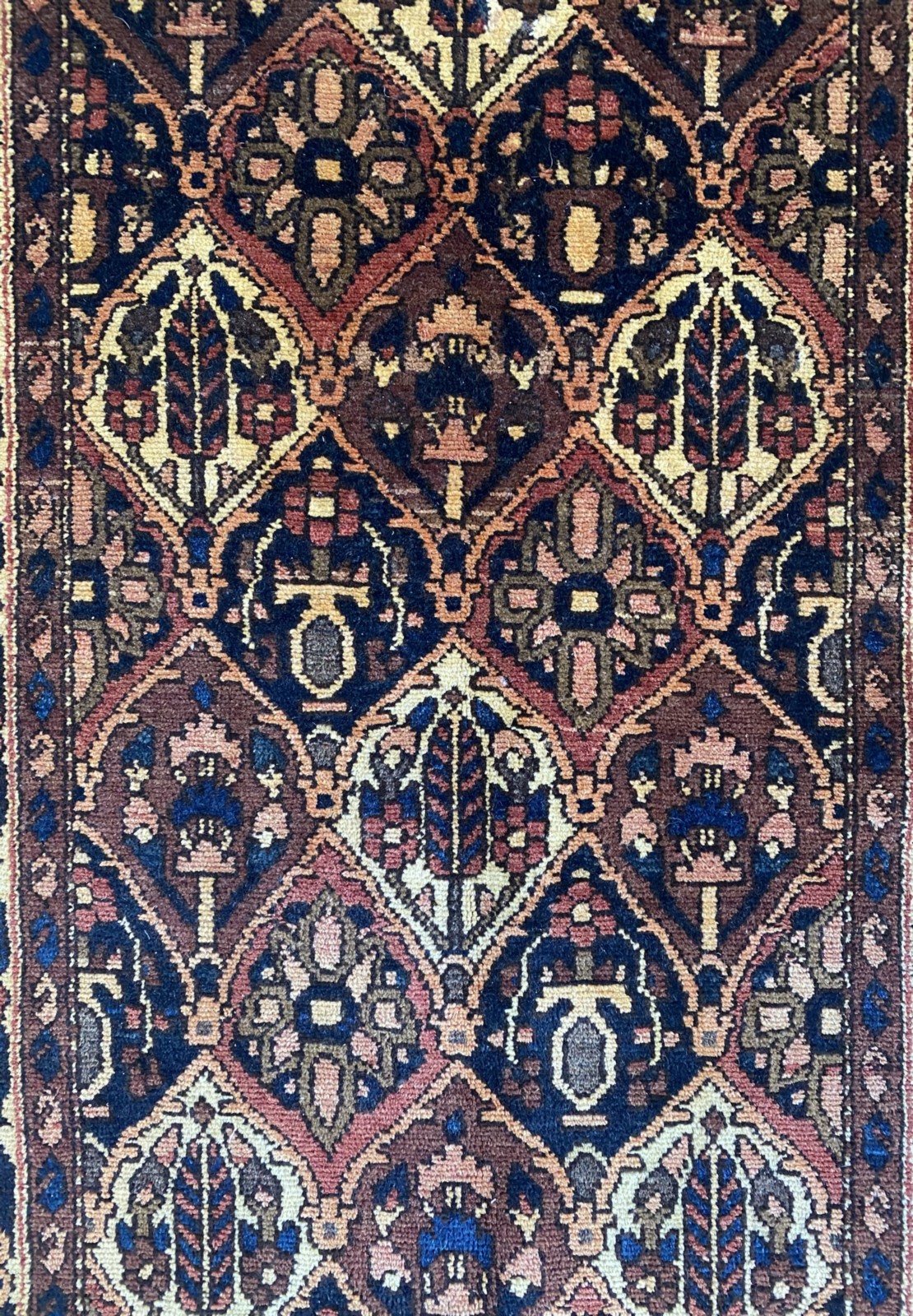 WOOLLEN PILE. NOMADIC BAKHTIARI WEAVE WITH PERSIAN TRIBAL GARDEN DESIGN WITH STYLIZED PANELS CONTAINING GARDEN THEMES OF CYPRESS TREE, FLORAL SHRUBS & URNS BEARING FLORAL FOLIAGE. MAJOR BORDER OF RAMBLING TENDRILS & FLORAL MOTIFS. MINOR BORDER OF PAISLEY MOTIFS. THE ENTIRE IN HUES OF TERRACOTTA, ROSE, CREAM, CARAMEL & BLUE.