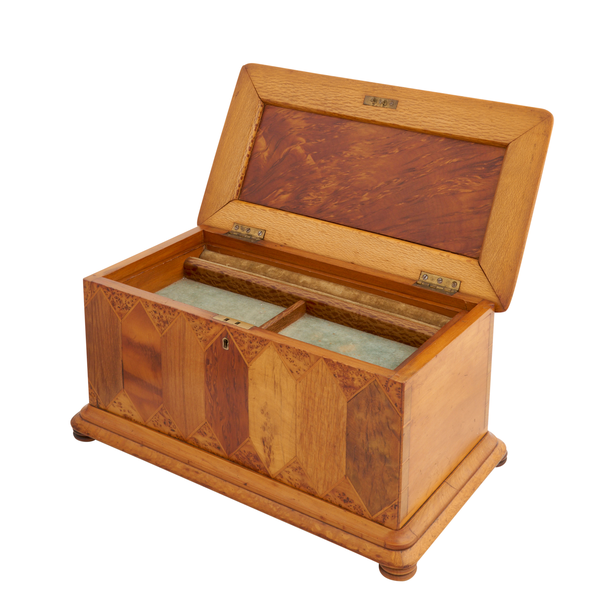 Rectangular with a hinged top with bevelled and moulded edges and moulded base on turned feet, the interior fitted with two removeable velvet-lined trays divided into compartments, the top and front geometrically-veneered in various New Zealand woods including burr totara, puriri, mottled kauri, rewa rewa, kohekohe, maire and others, the carcase kauri with contrasting mouldings in other woods