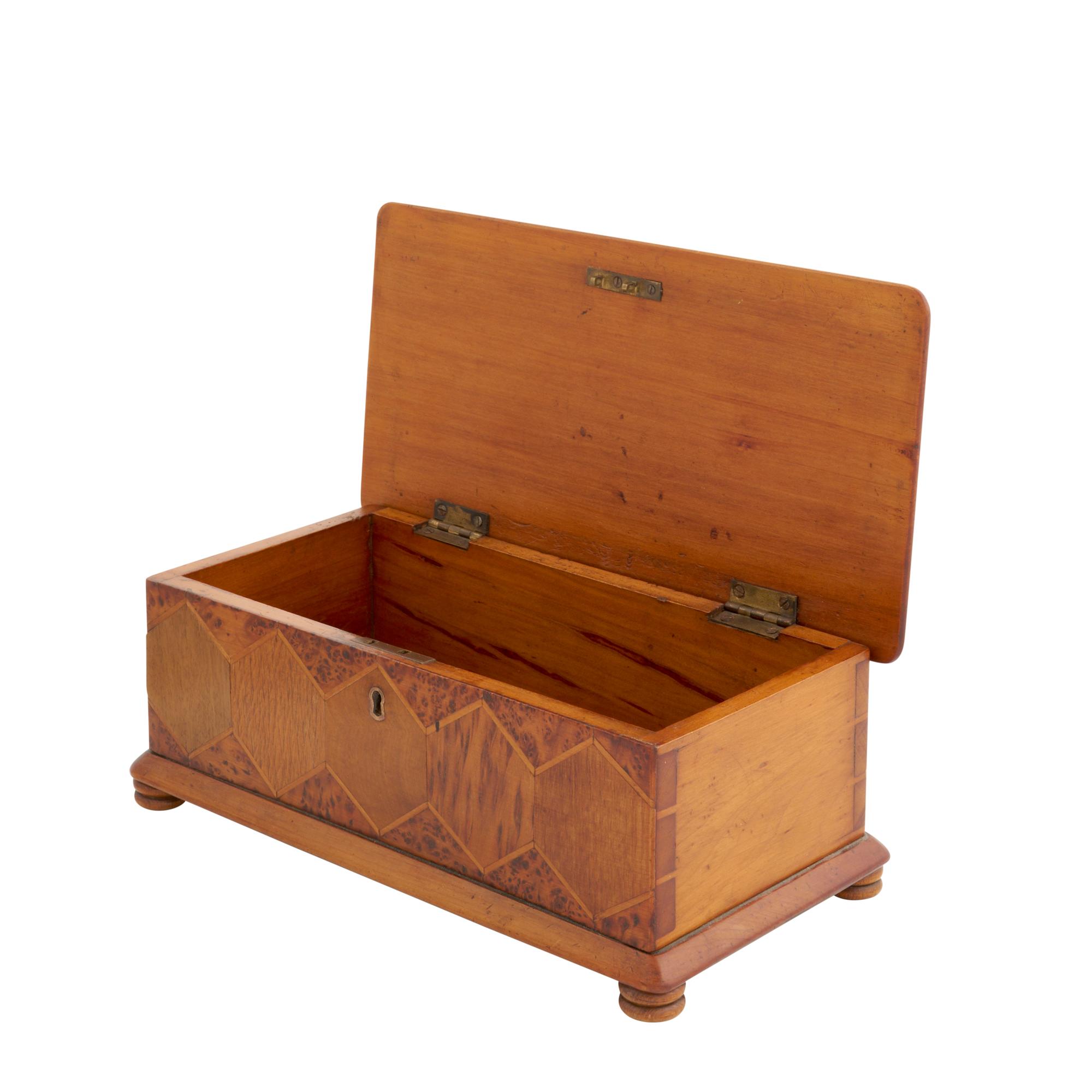 Rectangular with a hinged top with bevelled edges and moulded base on turned feet, the top and front geometrically-veneered in various New Zealand woods including burr totara, puriri, mottled kauri, rewa rewa, kohekohe, maire and others, the carcase kauri, the underside with a pencil diagram indicating the woods used