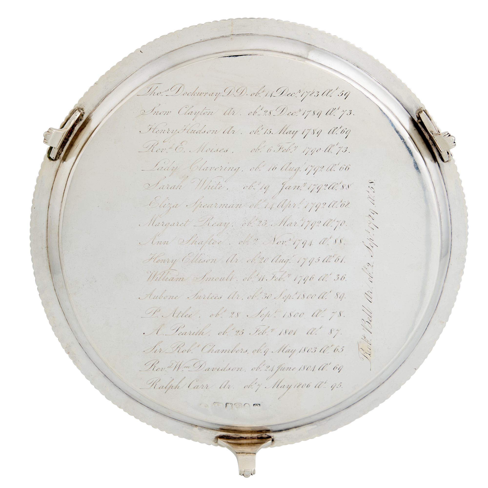 Circular with a moulded and gadrooned raised edge, standing on three thread-edged feet, the centre engraved with the heraldic crest of the Moises family and their motto 'Nisi virtus vilior alga', the underside engraved with a list of the names, death dates (variously from 1783 to 1806), and ages at death of Thomas Dockray, Snow Clayton, Henry Hudson, the Revd E. Moises, Lady Clavering, Sarah White, Eliza Spearman, Margaret Reay, Ann Shaftoe, Henry Elison, William Smoult, Aubone Surtees, P. Atlee, A, Pearith, Sir Robert Chambers, the Revd William Davidson, Ralph Carr, and Robert Bell