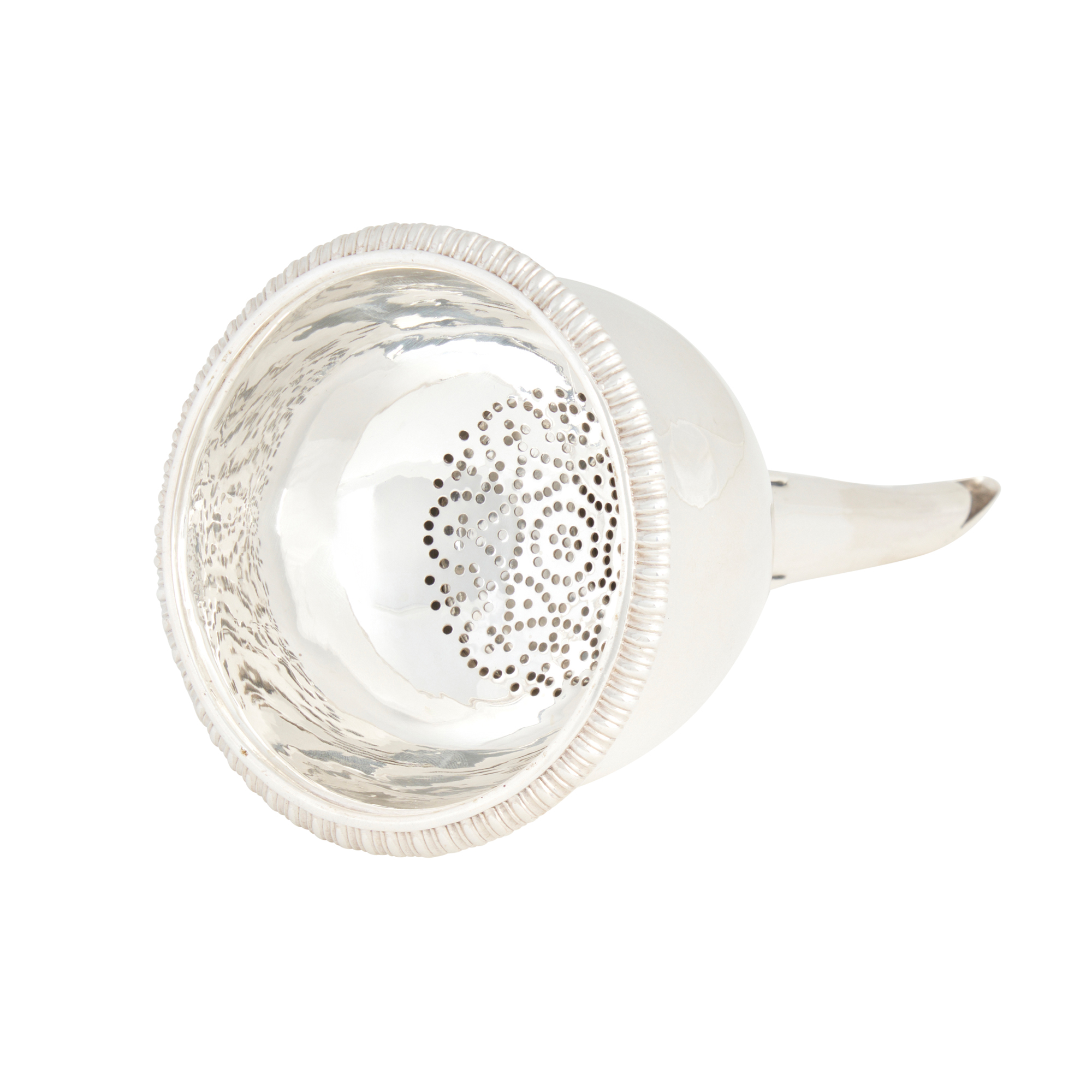 The removable strainer with gadrooned rim fitting into the plain reeded bowl of the funnel, fitted in a later nineteenth century leather case with retailer's mark for Walford & Spokes, Oxford