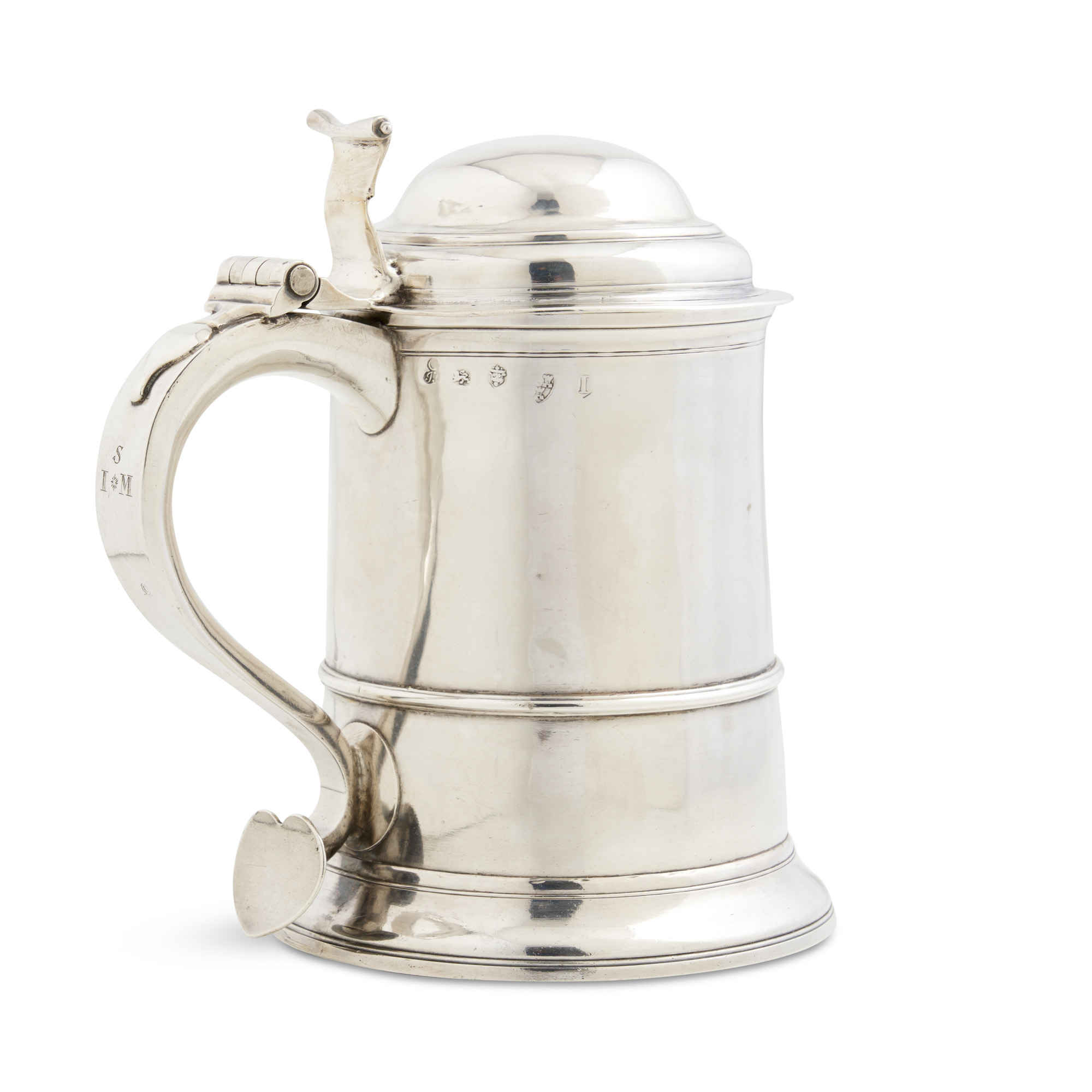 The spreading cylindrical girdled body on a moulded foot with a domed cover, the scrolling handled with a scroll thumbpiece and heart-shaped terminal, the handle engraved with initials S above I * M