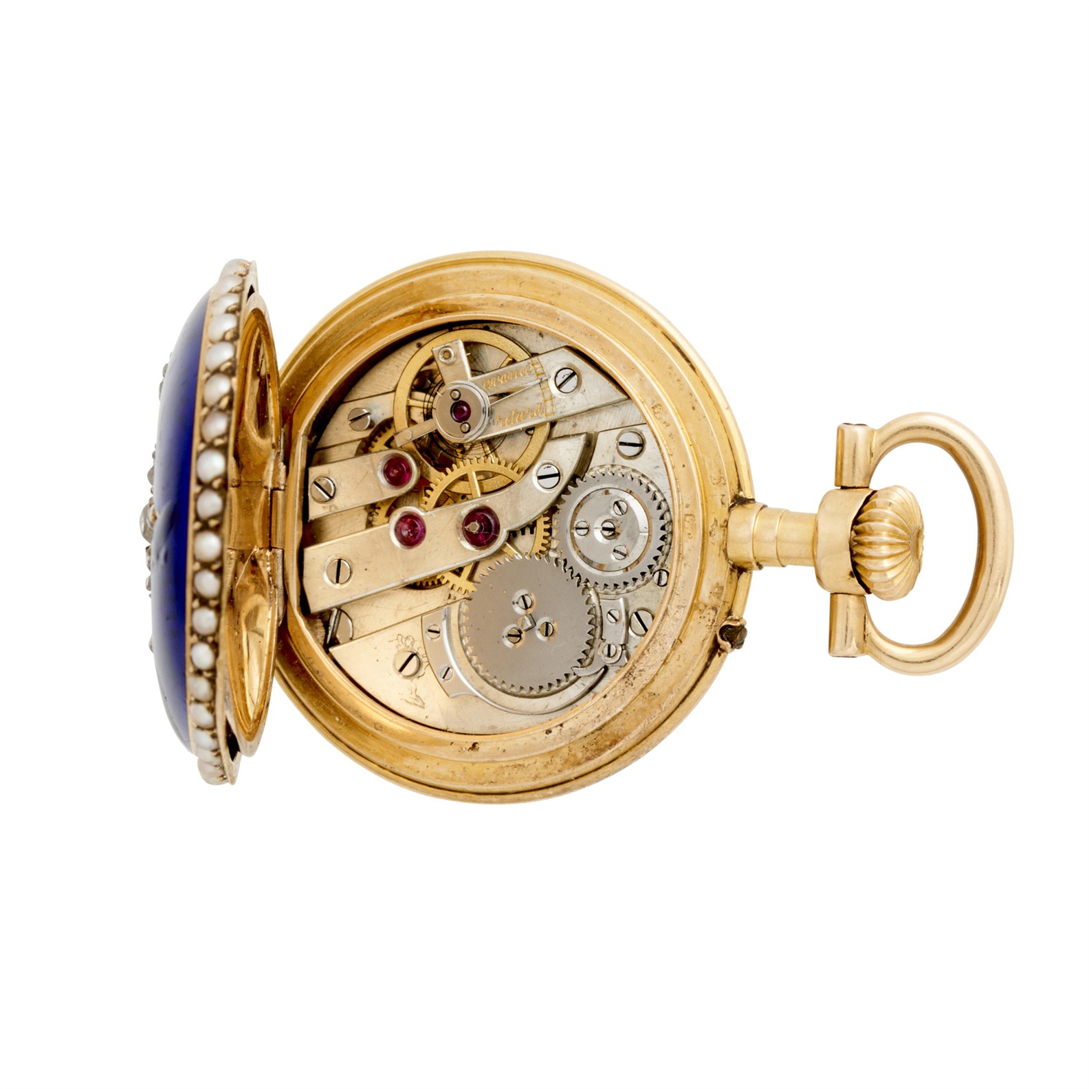 Dial: blue guilloché enamel dial with gilt Arabic numerals and beaded minutes within a bezel of seed pearls, gold scroll hands