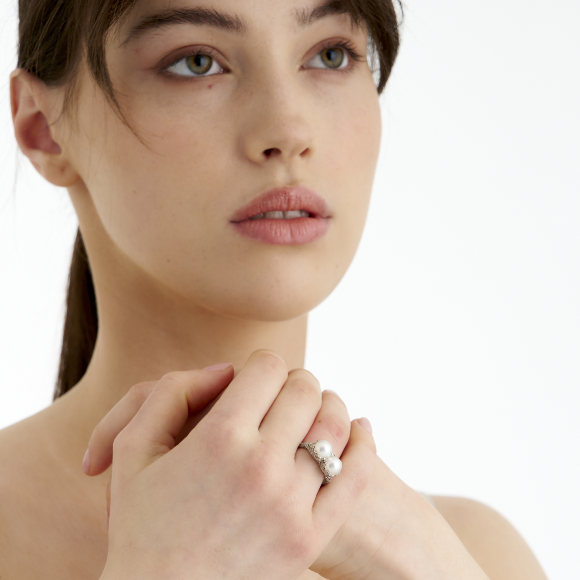 Featuring two cultured pearls of white hues measuring approximately 7.5mm, the raised surround, underbezel and shoulders milgrain-set throughout with single-cut diamonds, signed Proud, size N, gross weight approximately 5.4 grams.
