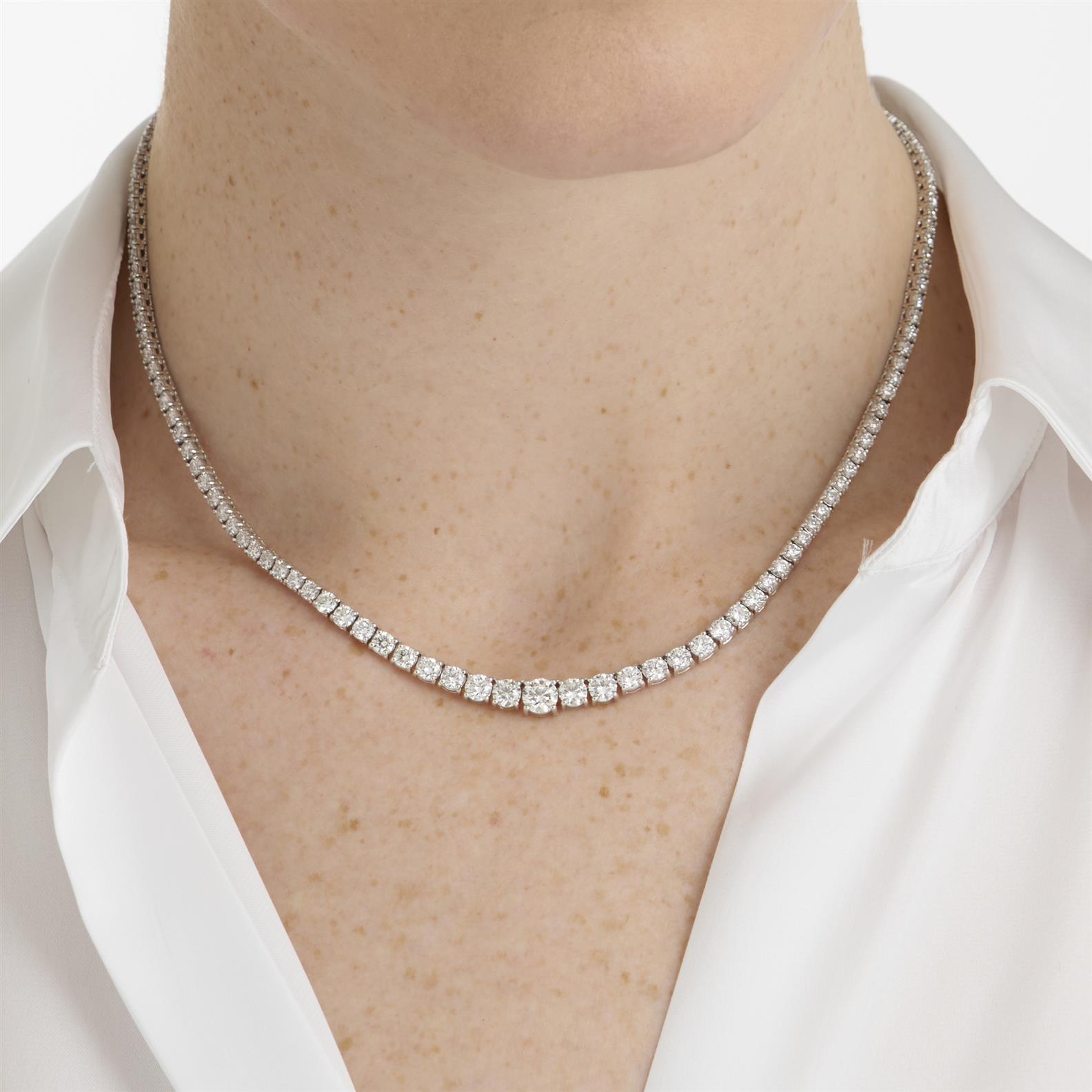 Composed of a graduating line of claw-set round brilliant-cut diamonds completed by a concealed box clasp, mounted in 14ct white gold, length 420mm.