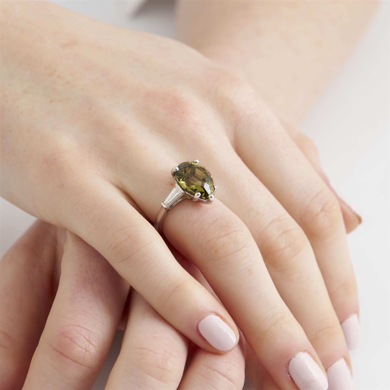 The pear modified brilliant cut Alexandrite is claw-set between a pair of tapered baguette diamonds, the diamonds together weighing approximately 0.20 carats, mounted in 18ct white gold, size M1/2.