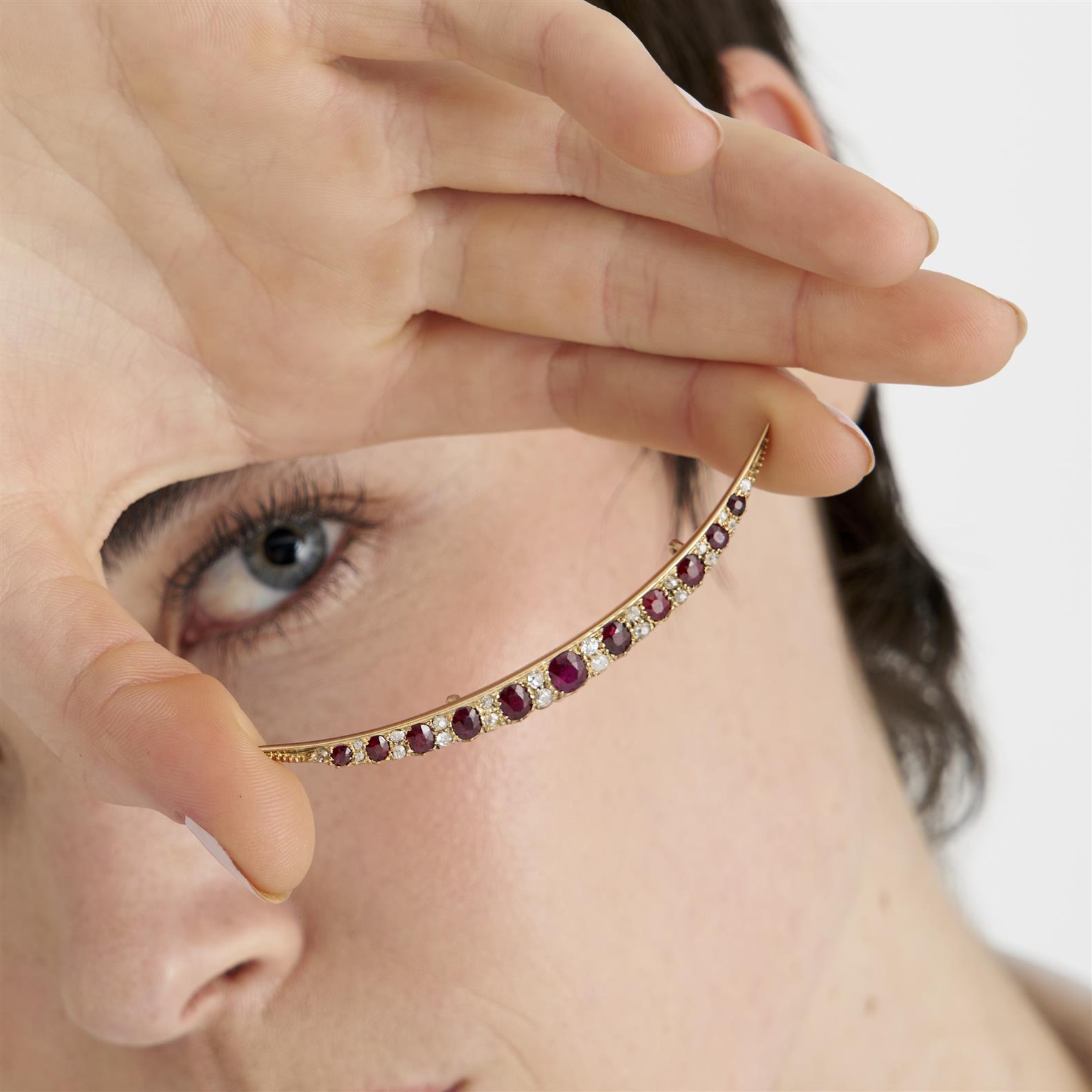 The Victorian brooch is composed of a line of cushion-shaped rubies between pairs of claw-set old cut diamonds, the 11 rubies and 22 diamonds together weighing approximately 4.00 carats and 1.00 carats respectively, mounted in 14ct gold, length 80mm.