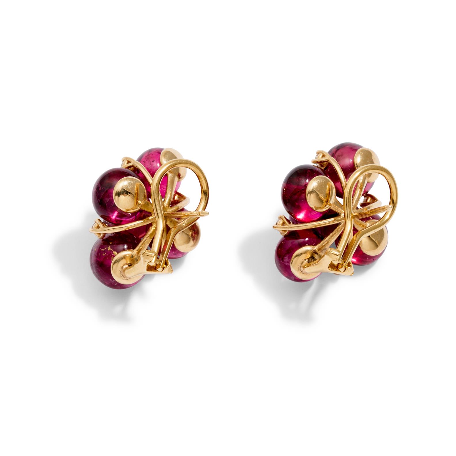 Each designed as a cluster of spherical pink tourmaline beads measuring 7.50 to 8.5mm, surmounted by a collet-set brilliant cut diamond between claw-set diamond accents, the diamonds together weighing approximately 0.34 carats, mounted in 18ct gold, length 22.5mm, 18.5mm, post and omega clip fittings.