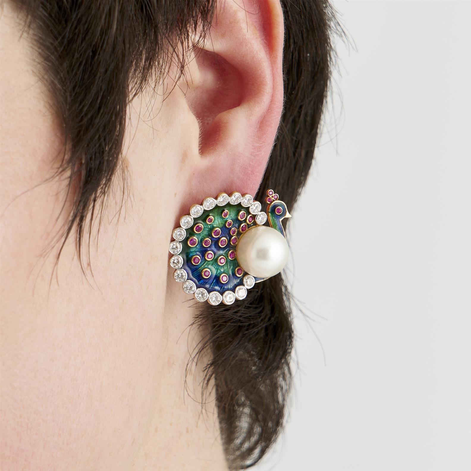 Each modelled as a stylised peacock, the body accented with a 11.8mm cultured pearl, the fan applied with green enamel decorated at intervals with collet-set circular-cut rubies and diamonds edged by similarly set diamonds, height 30mm, width 28.5mm, scroll and threaded post with omega clip fittings.