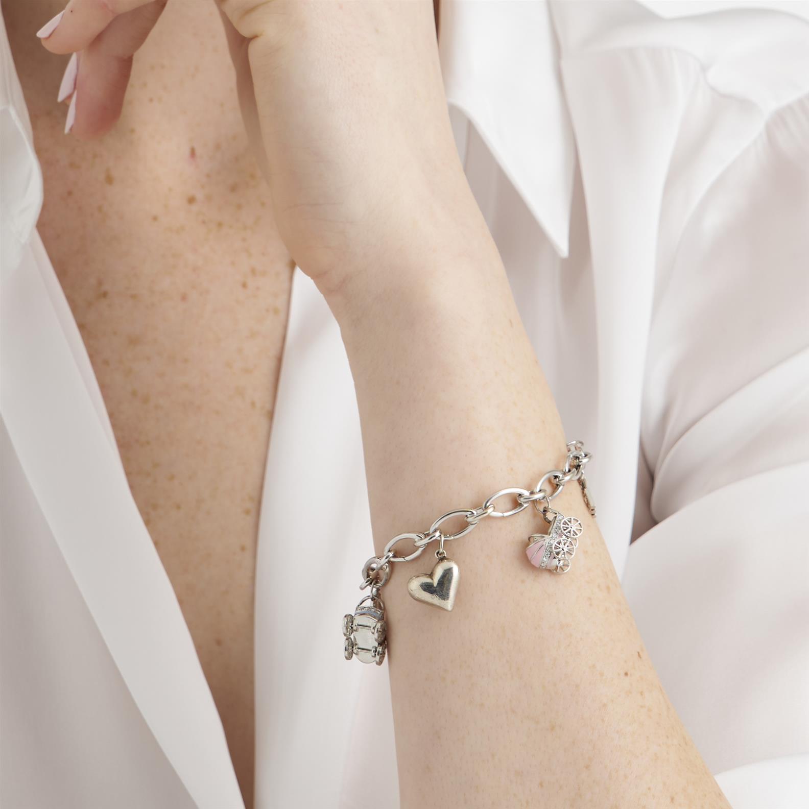 Composed of a line of oval links supporting five detachable Tiffany theme charms including a pavé diamond set LOVE logotype in platinum, a pink tourmaline set puffed 'Heart' in sterling silver, a pavé-set diamond and blue enamel 'Pram' in platinum, a pavé-set diamond and pink enamel 'Pram' in platinum, a pavé-set diamond 'Love' heart in platinum, length 175mm, bracelet signed T & Co for Tiffany & Co., the charms signed T & Co for Tiffany & Co.