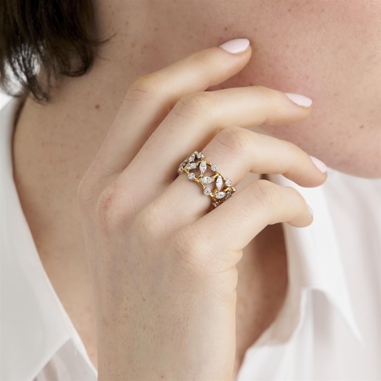 The 11.5mm wide openwork band is designed as a continuous line of claw-set marquise diamonds between a border of collet-set round brilliant-cut diamonds, the diamonds together weighing approximately 2.65 carats, mounted in 18ct gold and platinum, size O, signed Schlumberger Studios, Tiffany & Co.