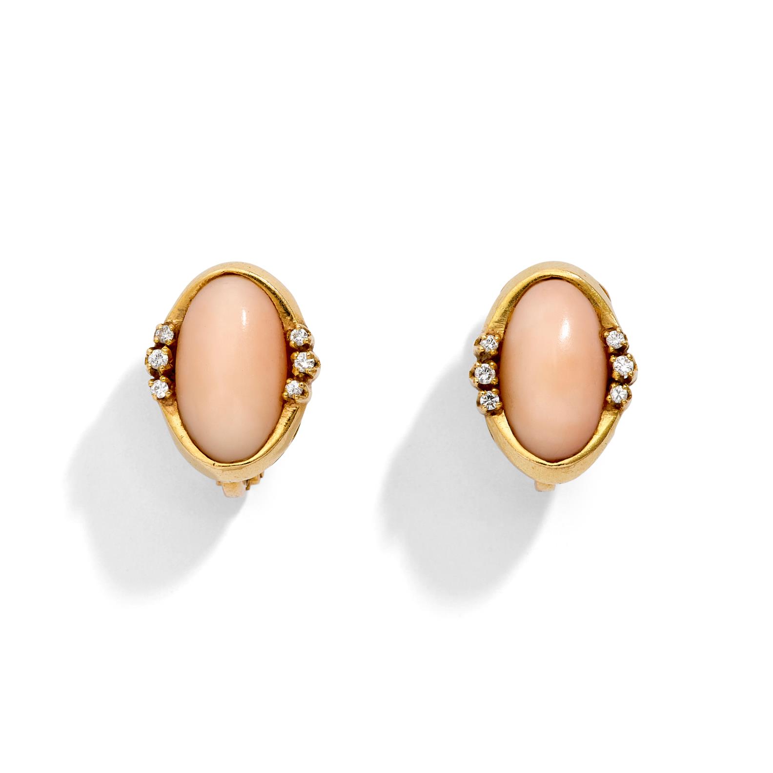 Comprising of: a necklace designed as a triple strand choker composed of uniform coral beads measuring approximately 10.0mm-10.5mm, completed by an 18ct gold oval clasp centring a cabochon oval coral framed by a rope edge partially decorated by 14 brilliant-cut diamonds, the diamonds together weighing approximately 0.38 carats; a later pair of coral and diamond earrings, necklace inner circumference 400mm, clasp 30mm long 21.5mm wide, signed Cartier, earrings length 16.5mm, width 12.5mm (2).