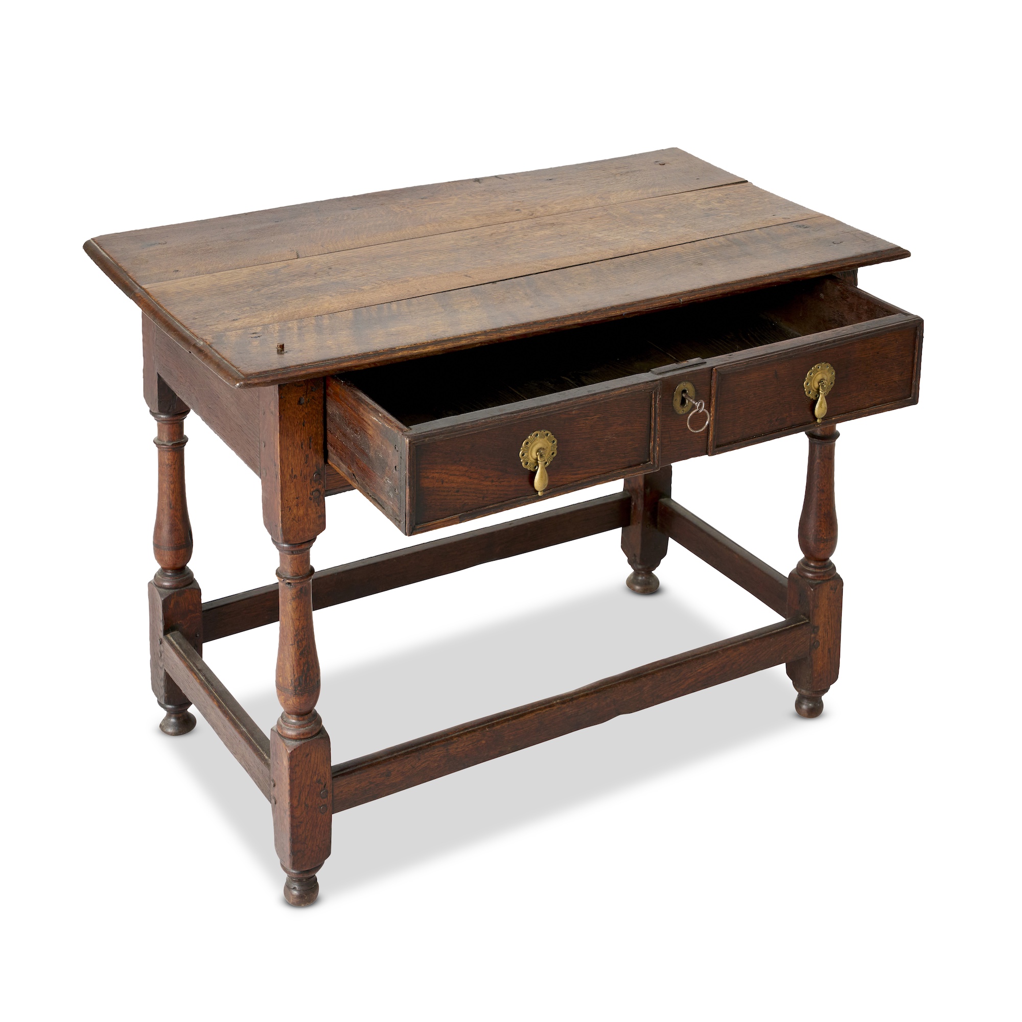 The rectangular top above a frieze drawer moulded in two panels, on baluster and block supports joined with peripheral stretchers, the brass drop pulls possibly original
