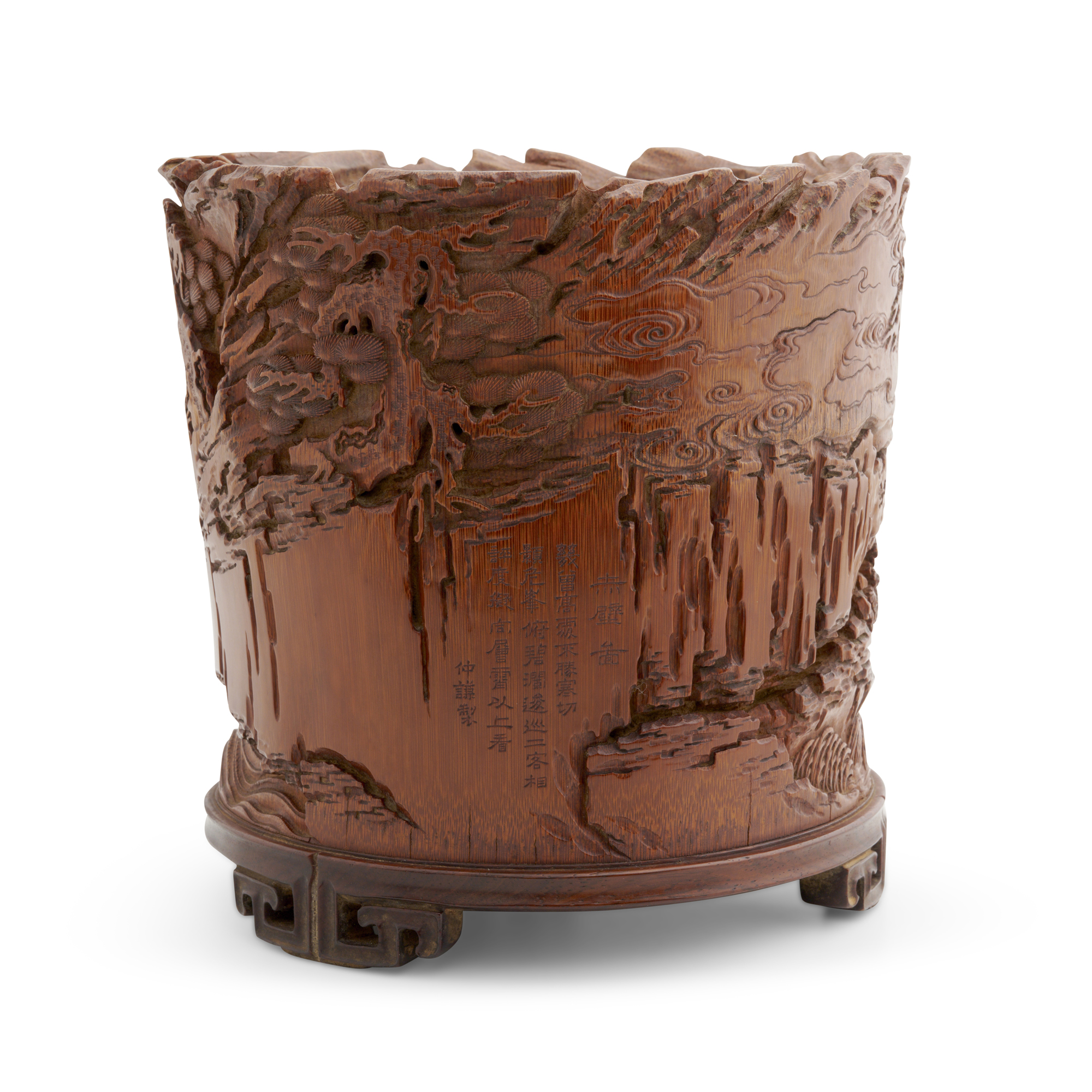 Of bamboo form with a rich brown patina, the sides deeply carved in high relief with Su Shi and his companions on a moonlit boat journey at the Red Cliff, surrounded by soaring cliffs, ancient pines and turbulent waves. The rocky face bears an inscription of a Qianlong imperial poem, with the signature Zhongqian zhi.