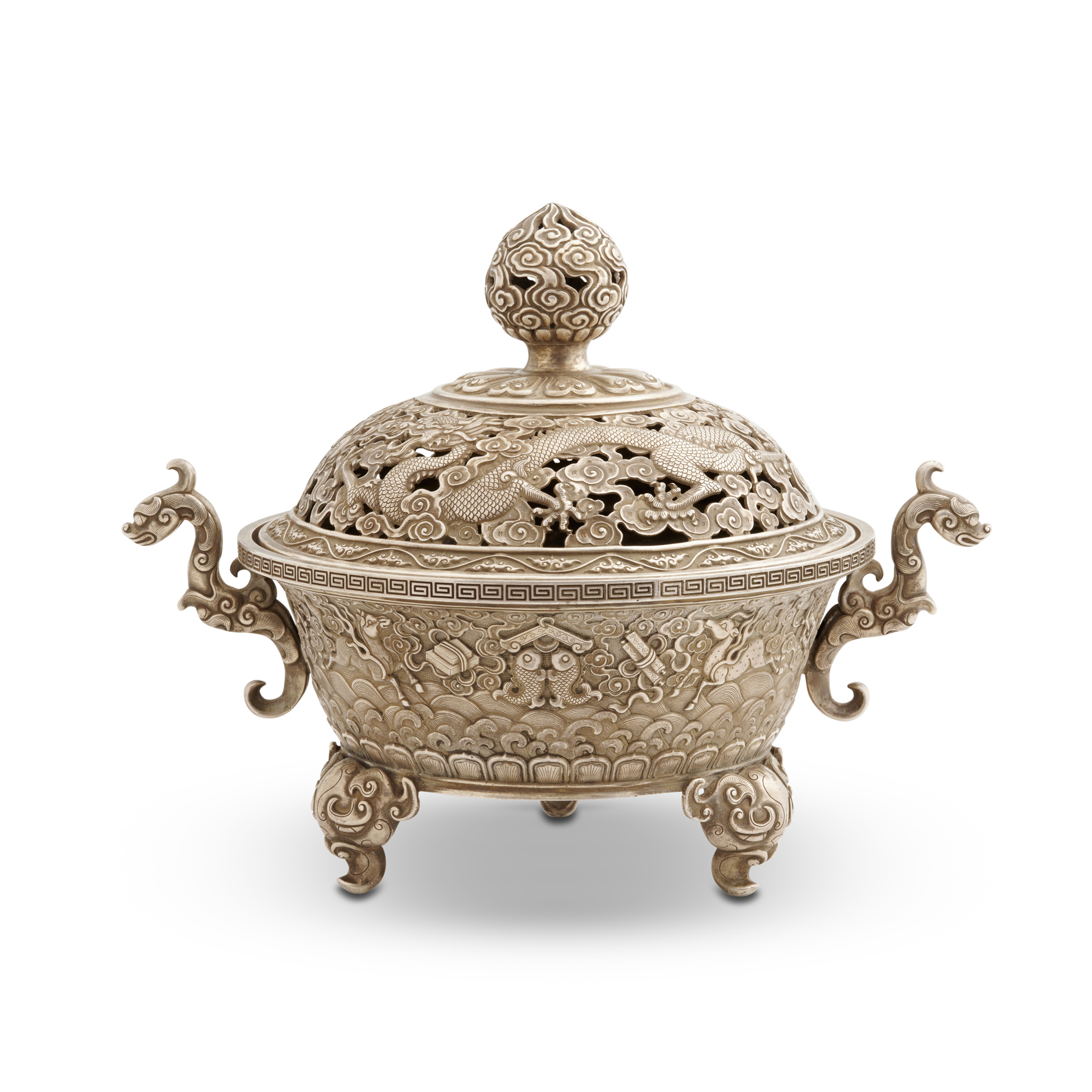 A RARE AND FINE CHINESE SILVER CENSER AND COVER, QIANLONG MARK POSSIBLY OF THE PERIOD (1736 - 1795)