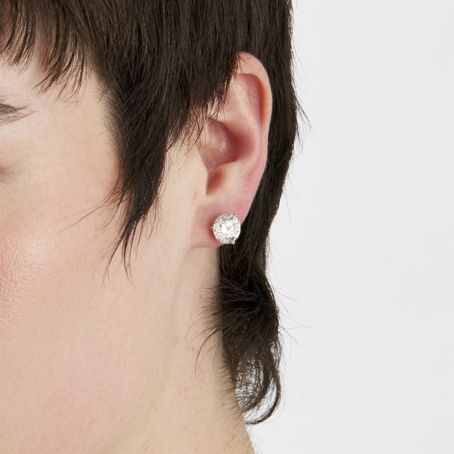 The round brilliant-cut diamonds together weighing 6.95 carats are claw-set, mounted in 18ct white gold, threaded post and scroll fittings.