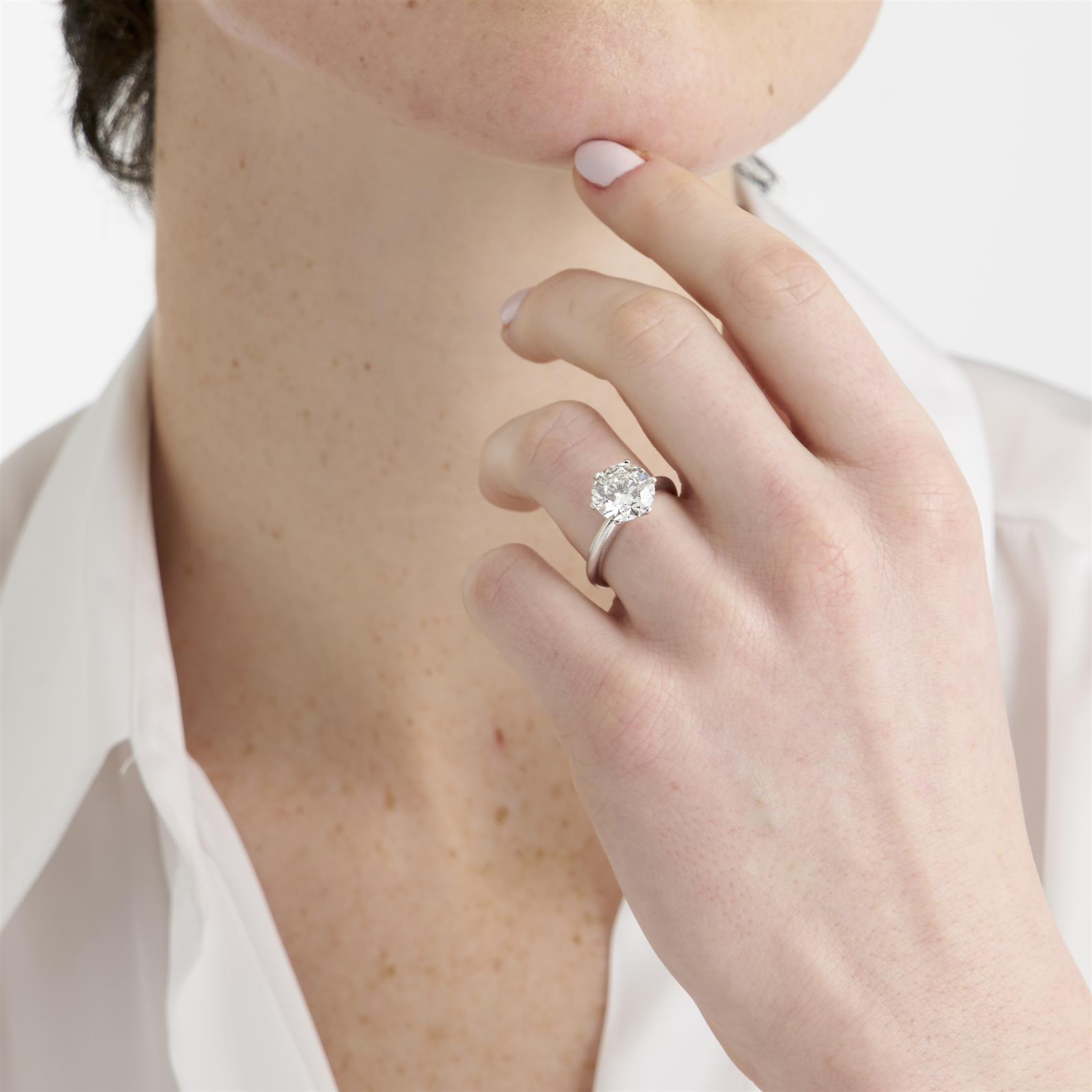 Centring a claw-set round brilliant-cut diamond weighing 4.31 carats, mounted in platinum, size Q.