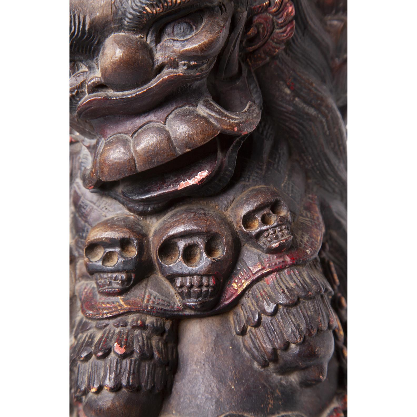 19th/20th century, the powerfully carved and polychromed child-devouring witch, wearing garlands of skulls and holding the child she is about to devour in the right hand.