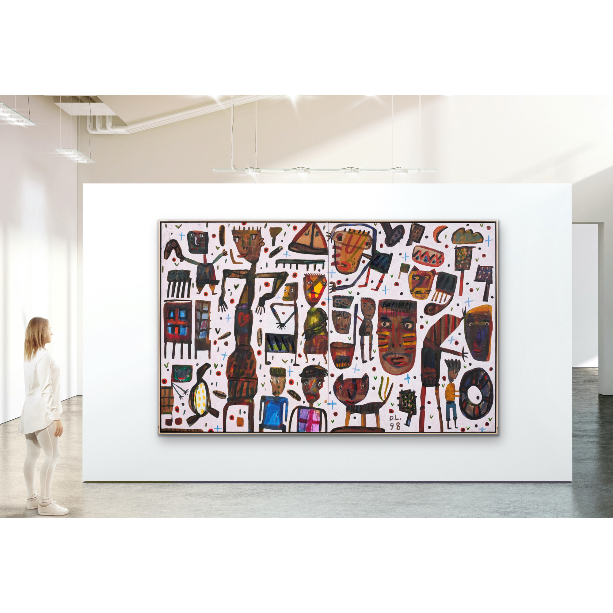 Influenced by the artists Jean-Michel Basquiat and Pablo Picasso, David Larwill has drawn on an array of cultural influences such as prehistoric, International and Aboriginal Art, to create his body of work. The painting 'Games' 1998, highlights these influences through his use of flatness, bright colours and layering of dark, silhouetted forms that contrast with the white background. Larwill's work is full of energy and imagination and his subjects pose playfully, moving across the canvas in a pattern like sequence. The naïve designs floating around each figure are reminiscent of the technique used by Basquiat to emphasise movement and inject a playful childlike energy to the work.