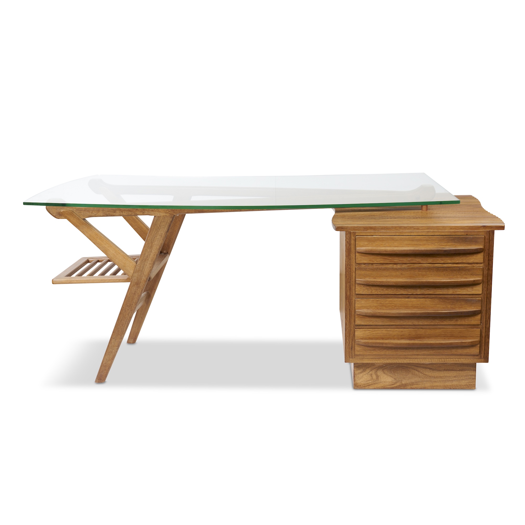 The lightly-curved rectangular bevelled glass top on a hairpin-shaped framed raised on a pedestal of drawers to one side and a pair of splayed and cantilevered supports to the other, the pedestal with ribbed top and sides enclosing four drawers to its front and a shallow bookcase to the rear, the supports with a removeable mid-height slatted shelf, the angle of the pedestal relative to the top adjustable (the top pivoting on the pedestal)