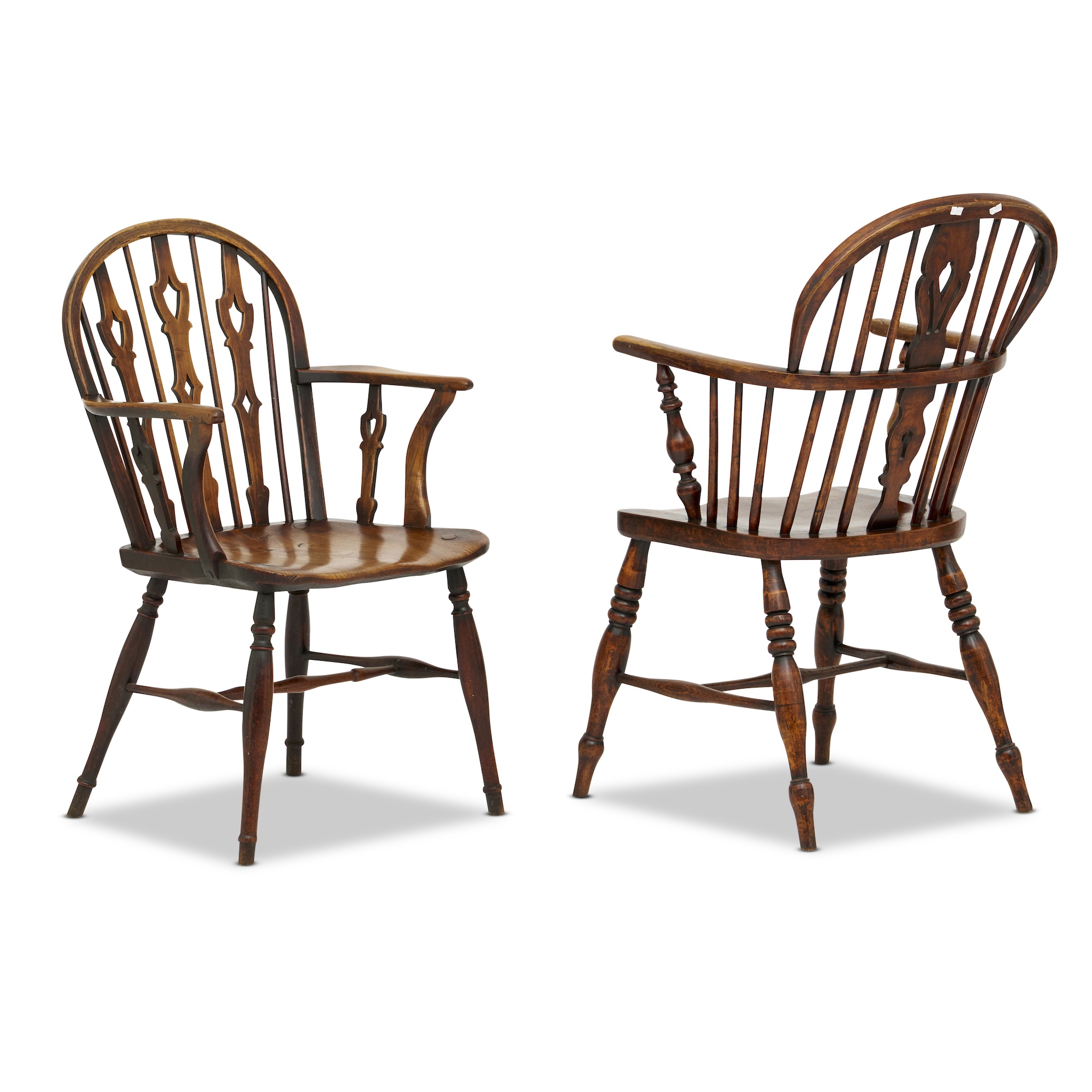 TWO LATE GEORGIAN ELM AND FRUITWOOD WINDSOR CHAIRS