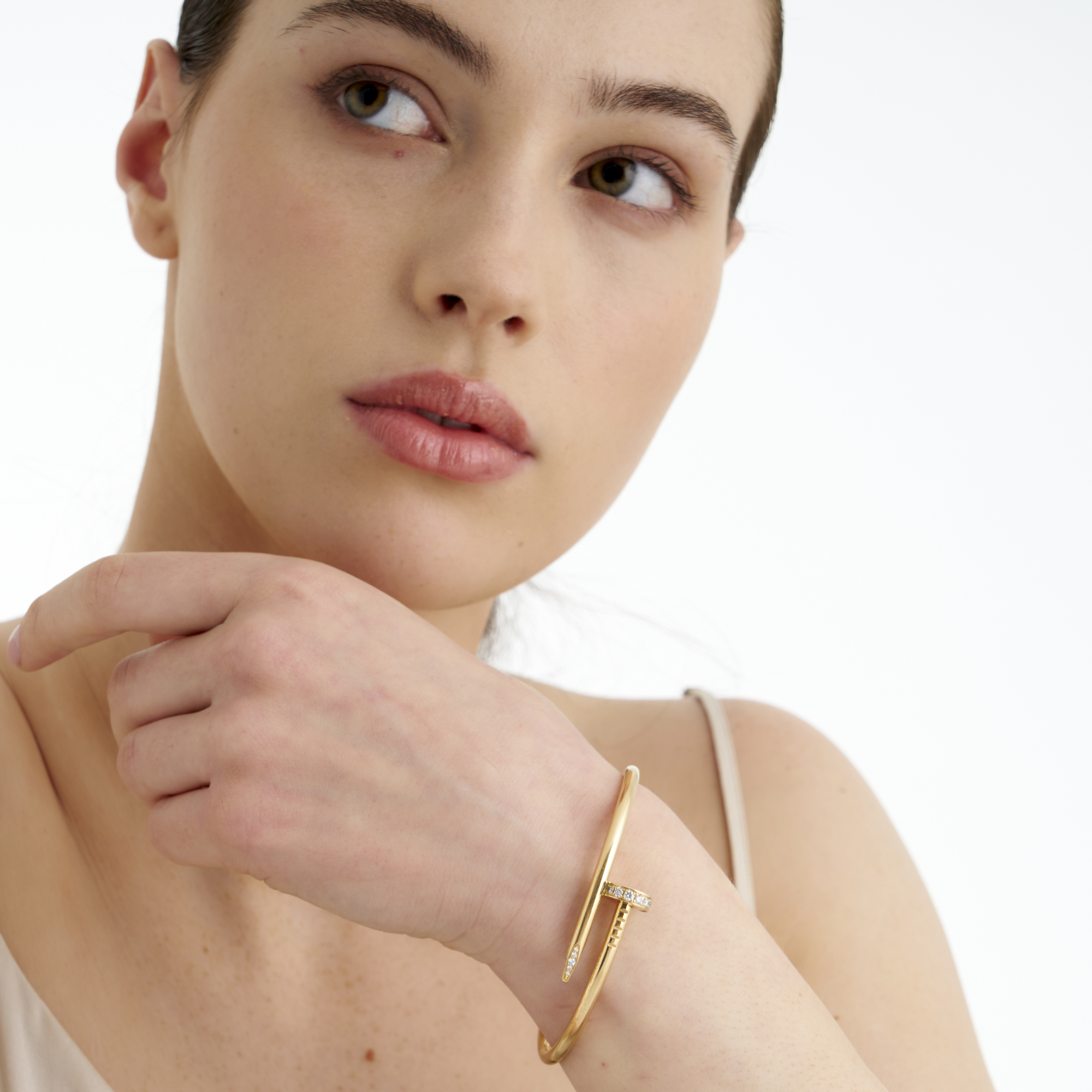 The hinged oval cuff modelled as an asymmetrical nail, the head and shank partially pavé-set with round brilliant-cut diamonds together weighing approximately 0.58 carats, signed Cartier, numbered HQM377, inner circumference 180mm (18), gross weight approximately 33.6 grams.