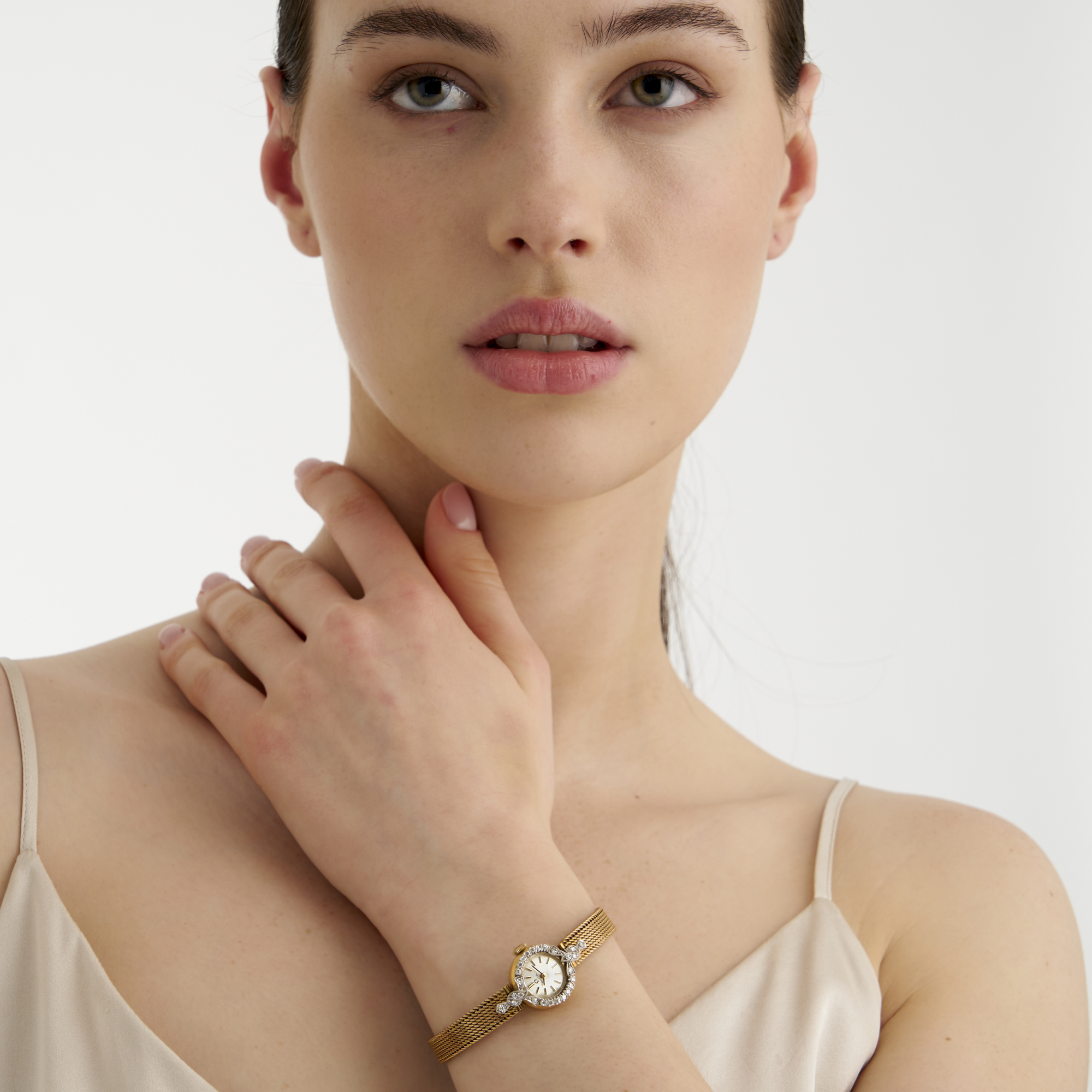 Case: 18ct gold polished round, diamond-set bezel and ribbon lugs, snap on case back, no. 6011